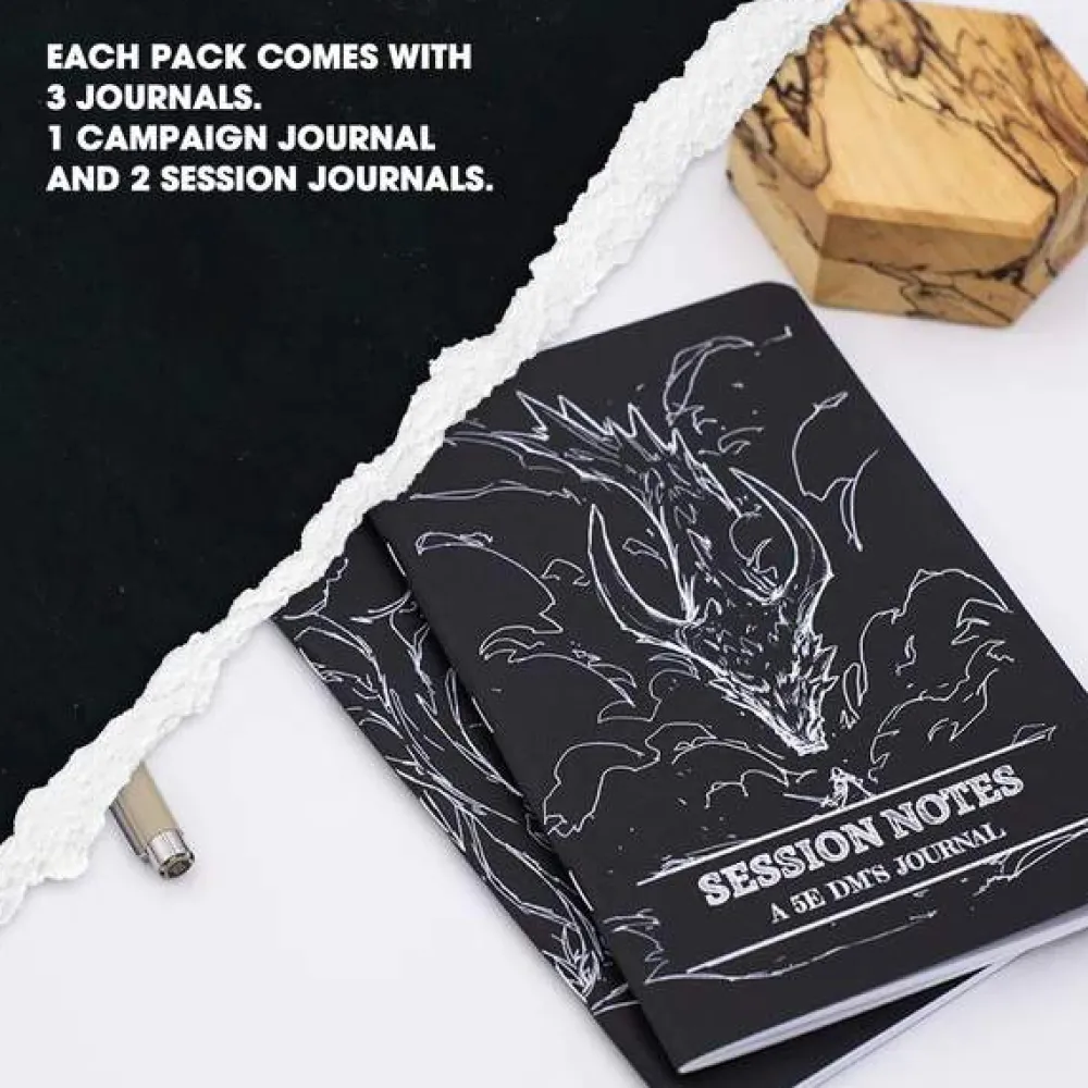 - 2 Session Journals: The ultimate DM journal template for up to eight sessions. Keep track of NPC creation, creature builds, player stats, and more.