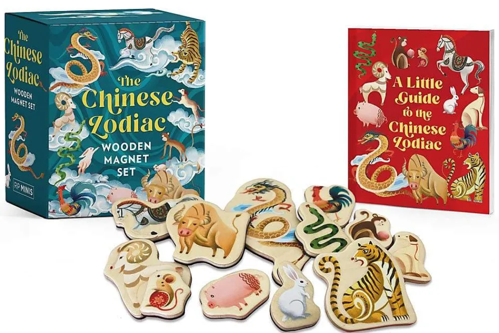 Bring good fortune to your home or office with this keepsake set that includes 12 Chinese zodiac wooden magnets and a mini guidebook.
