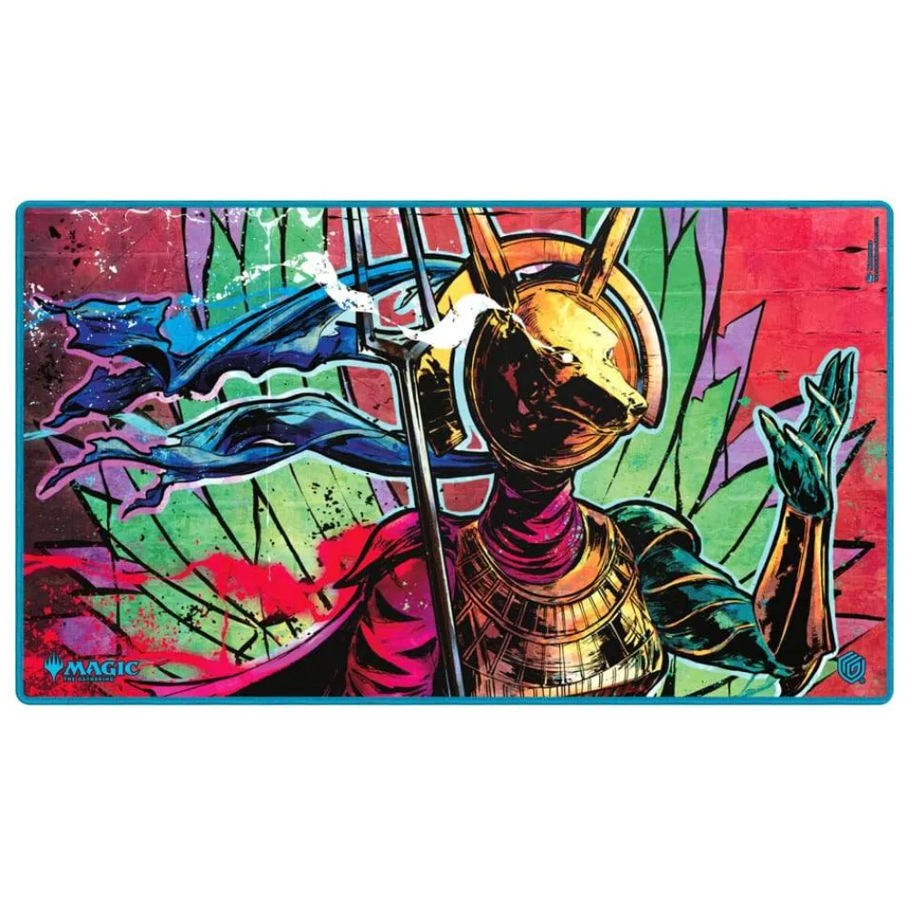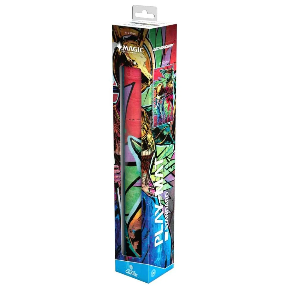 The Play-Mat in the standard size 61x35cm shows officially licensed artworks from Magic: The Gathering’s set Aetherdrift. The soft cushioned Play-Mat with non-slip underside improves the gaming experience, protects gaming cards and accessories, and is even more durable than classic Play-Mats thanks to its stitched edges.