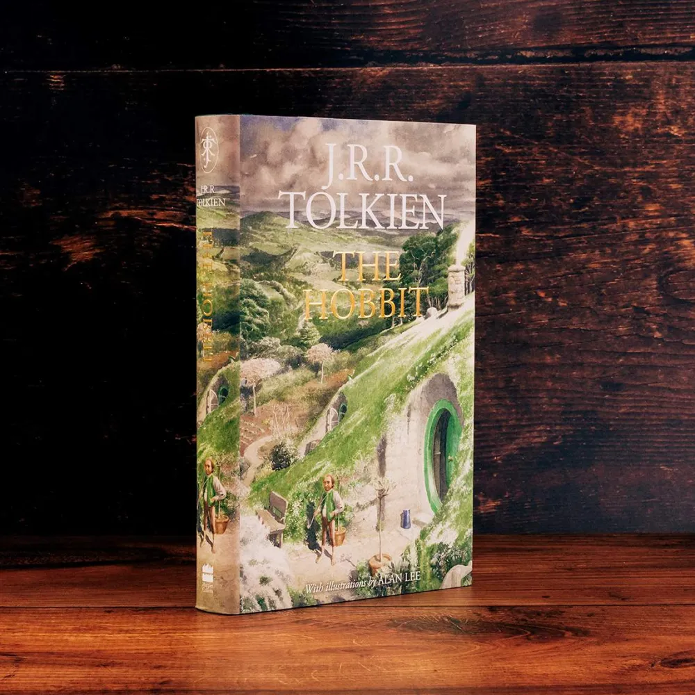 Bilbo, som i utgangspunktet er motvillig til å delta, overrasker både seg selv og sine følgesvenner med sin oppfinnsomhet og dyktighet som innbruddstyv. Denne utgaven av boken er nøye revidert og korrigert i samarbeid med Christopher Tolkien, og er rikt illustrert med vakre akvarellmalerier og delikate blyanttegninger av Alan Lee.
