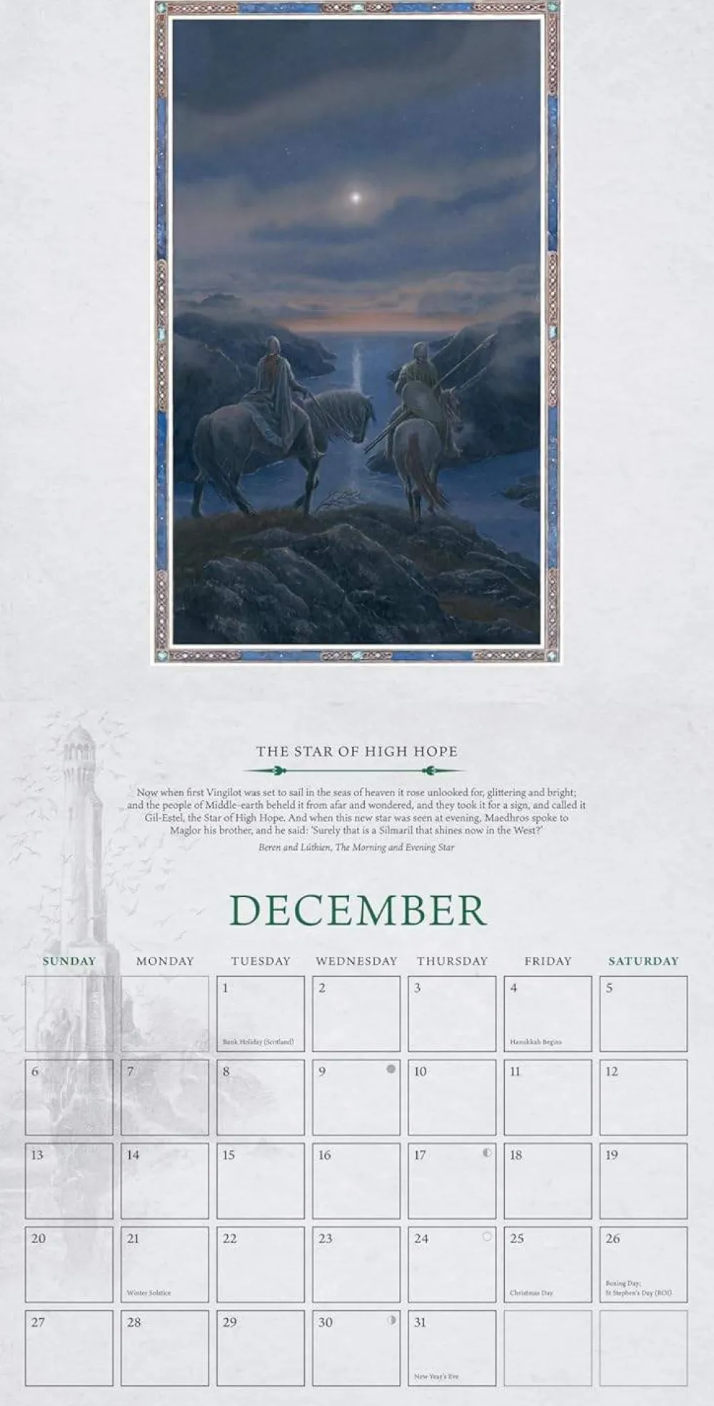 This year’s calendar showcases 13 full-colour paintings by Alan Lee of scenes from across the First Age of Middle-earth, depicting key moments from the three ‘Great Tales’ – The Children of Húrin, Beren and Lúthien and The Fall of Gondolin – that were published posthumously by Christopher Tolkien. Together they form the capstone to his unique literary contribution to our appreciation of his father’s invented world.