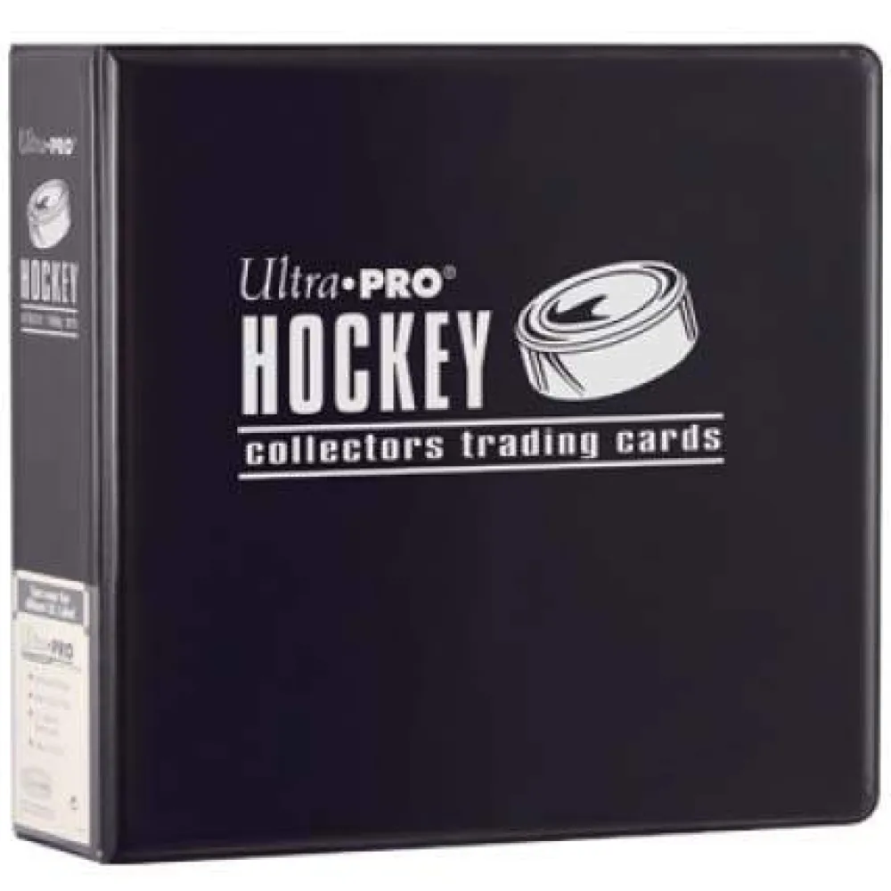 Premium album for standard size pages with hockey themed hot stamp foil on black cover. Reinforced 2 inch D-ring with booster for quick loading of pages. Albums include rich foam padding. Constructed with clear indexing slot on the spine for easy organization.