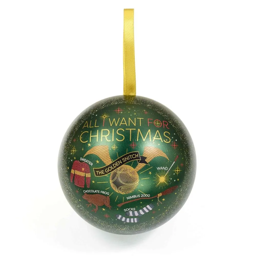 A Green metallic tin bauble with a Golden Snitch design, opens to reveal a gold-plated Golden Snitch bracelet.