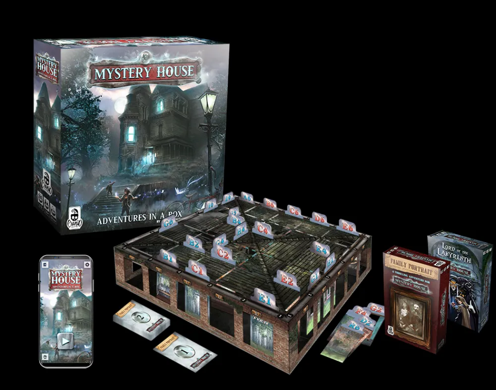 Dette huset beveger seg på mystisk vis gjennom tid og rom, og ingen vet dens endestasjon. Er du modig nok til å gå inn? Opplev spenningen av et “escape room” i Mystery House: Adventures in a Box, som inneholder en blanding av teknologi og tradisjon. Du er låst inne i huset, og den eneste måten ut er å løse gåtene du finner på veien! Poenget i dette spillet er å lete etter spor. I begynnelsen av spillet setter du “enigma” kort i sine respektive plasser. Imens spillet går fremover forteller disse kortene en historie som du som spiller må oppdage for så å løse. En app driver deg og dine venner gjennom spillet og holder styr på fremgangen til deg og dine medspillere. Grunnspillet består av to eventyr: “Familie portrettet” og “Lorden og labyrinten”. Alle fremtidige utvidelser vil bruke denne versjonen som sin base. Spillet varer i 60 minutter og er ment for 1-5 spillere.