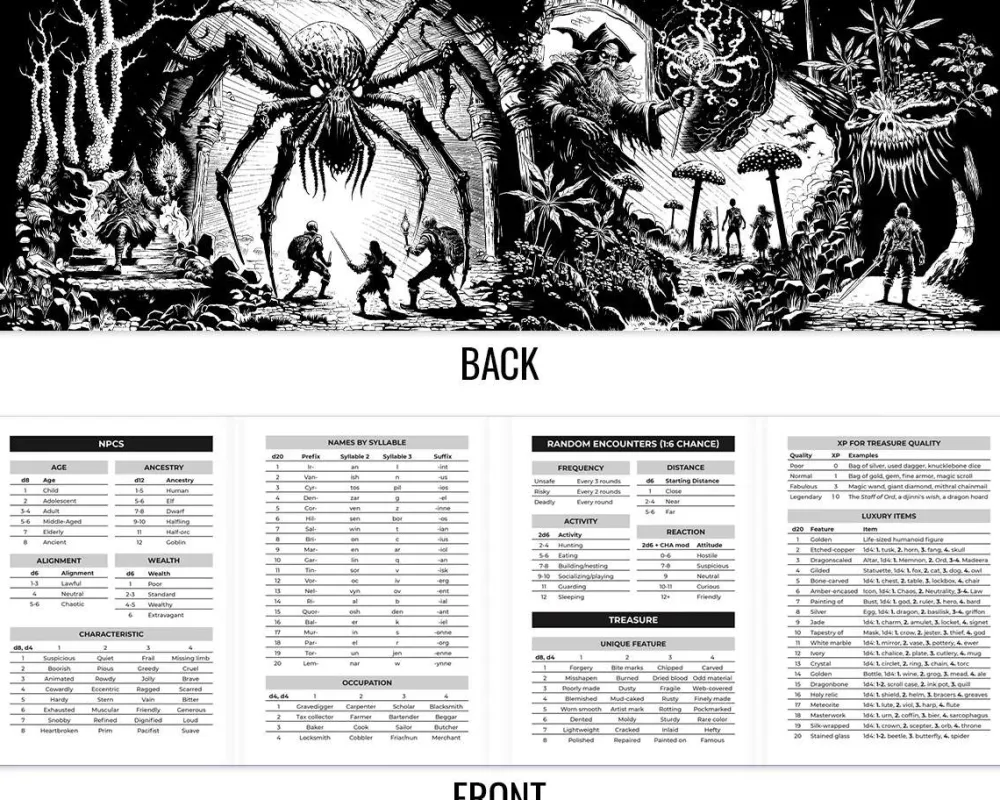 Four panels of wicked art on the back and generation tables on the inside to help you improvise and keep the game moving.