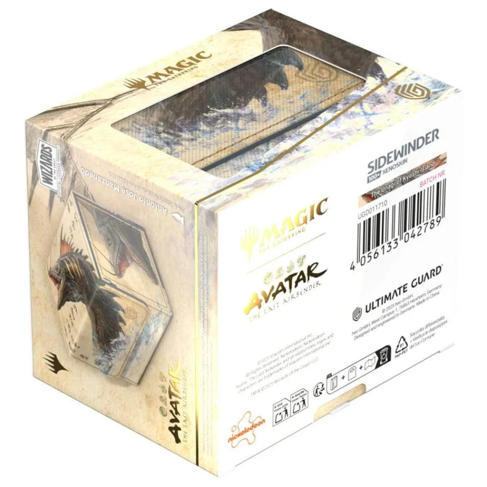 The Sidewinder 100+ made from durable Xenoskin material holds up to 100 double-sleeved cards, which are kept secure in the deck box thanks to a strong magnetic closure and soft microfiber inner lining. The durable, high-quality Xenoskin surface of the Sidewinder is printed in full color with officially licensed artwork from the Magic: The Gathering | Avatar: The Last Airbender set.