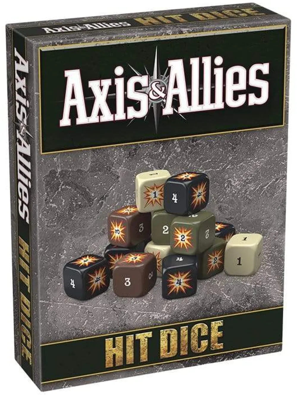 Upgrade your battles with Axis & Allies Hit Dice! Roll all dice for large battles at one time and quickly see how many hits are scored. There are a total of 72 dice in four styles: one hit, two hit, three hit, and four hit… all stored in a military style Dice Duffel Bag.