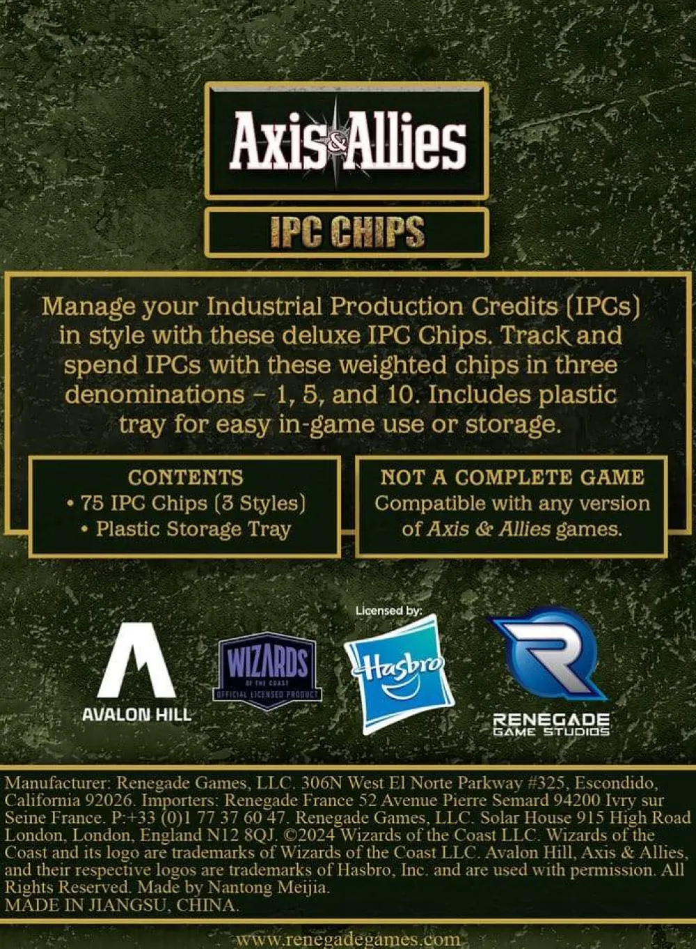 Manage your Industrial Production Credits (IPCs) in style with these deluxe IPC Chips. Track and spend IPCs with these weighted chips in three denominations – 1, 5, and 10. Includes plastic tray for easy in-game use or storage.