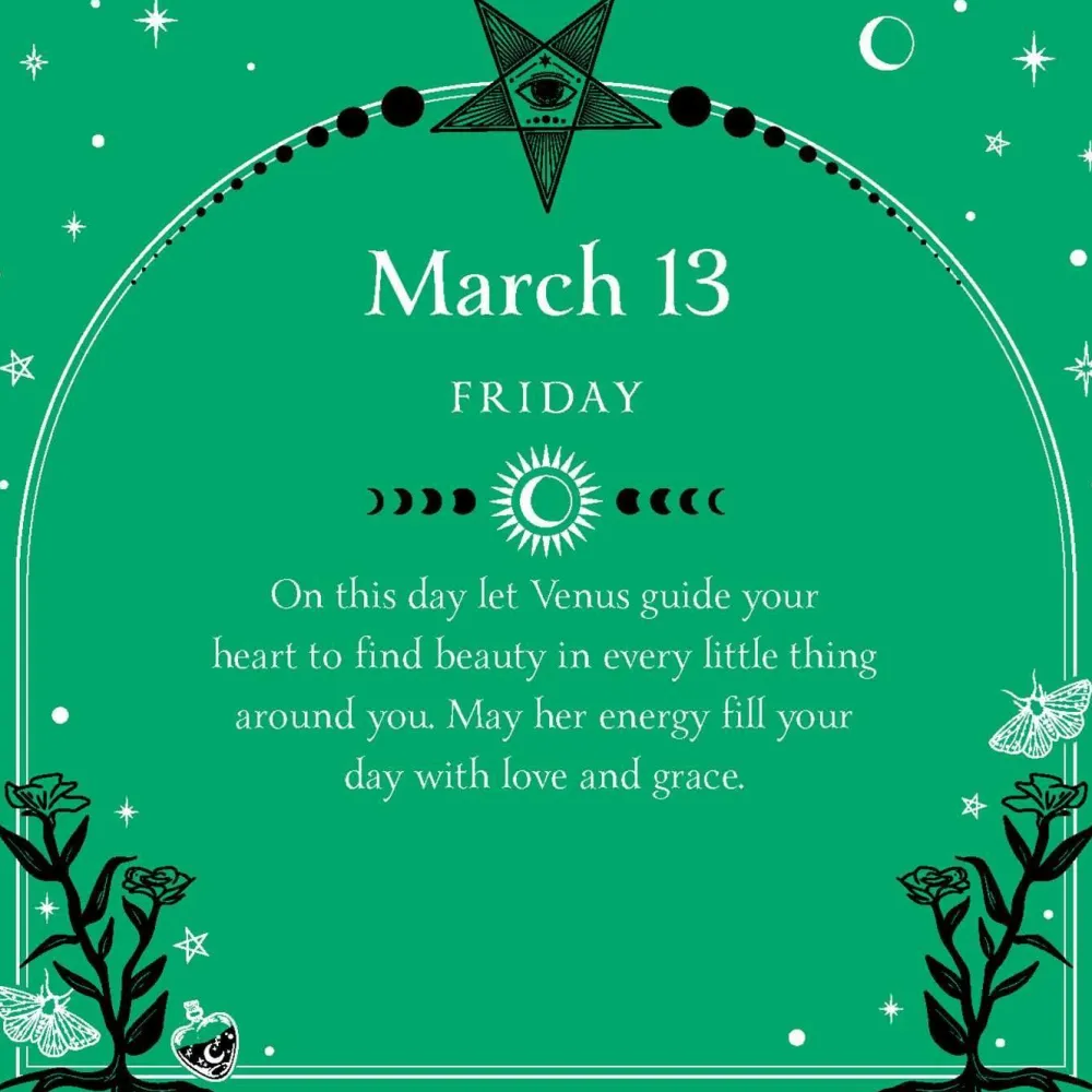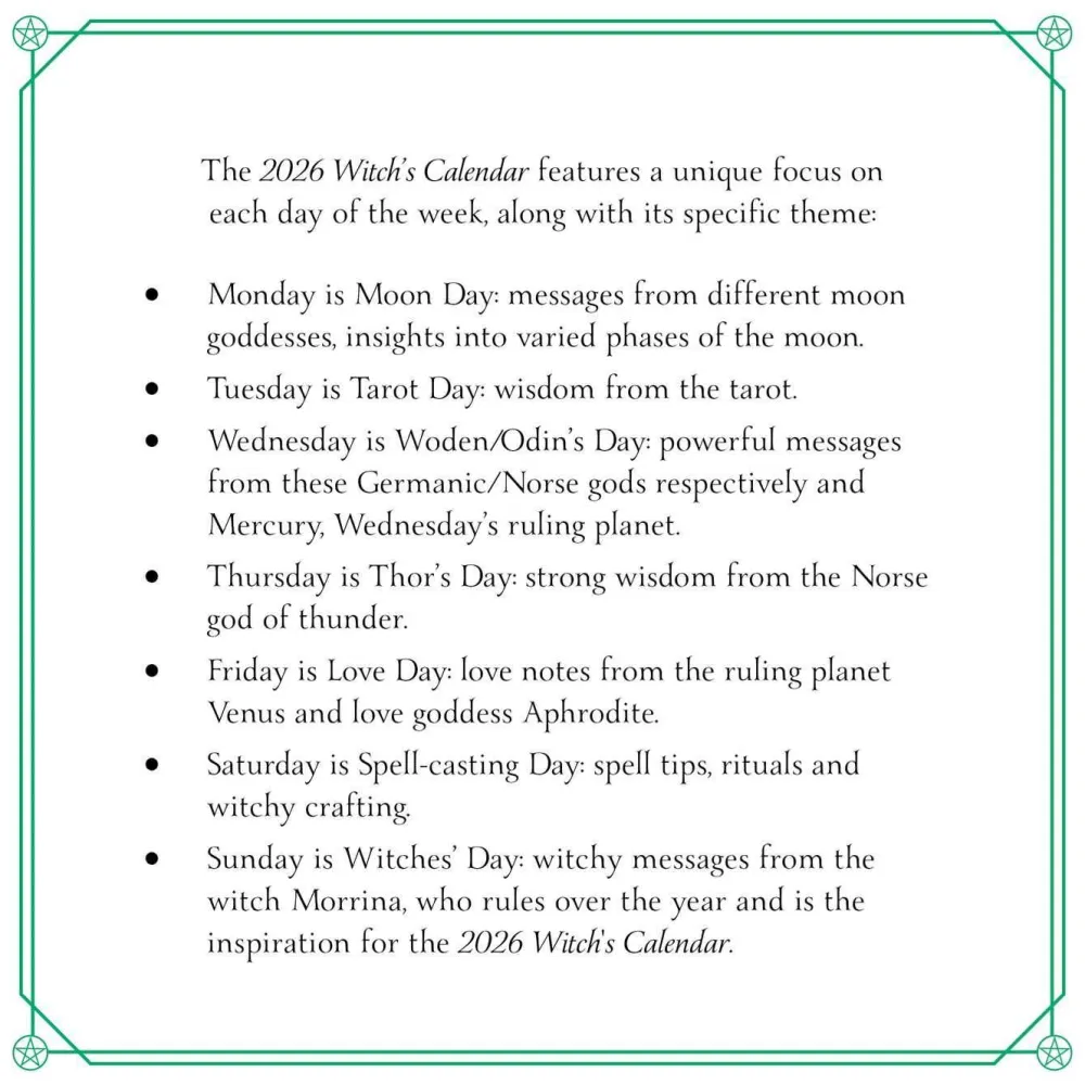 The 2026 Witch’s Desktop Calendar features a unique focus on every day of the week, each with its specific theme, from Moon Day (Monday) to Witches Day (Sunday). Daily messages are tailored to the magical frequencies of the weekday and include wisdom from gods and goddesses sacred to that day as well as tarot insights and witchy inspiration from Morinna, the witch who rules over the year. Every day you’ll discover witchy wisdom, rituals and prompts that will inspire you to live a more magical life.