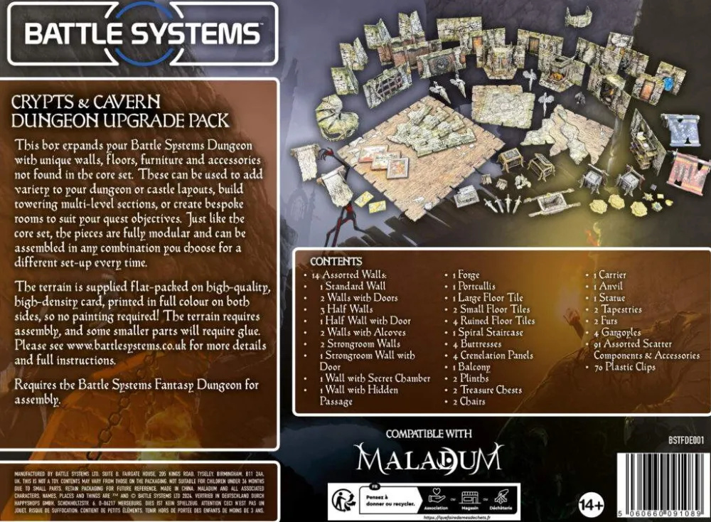 This box expands your Battle Systems Dungeon with unique walls, floors, furniture and accessories not found in the core set. These can be used to add variety to your dungeon or castle layouts, build towering multi-level sections, or create bespoke rooms to suit your quest objectives. Just like the core set, the pieces are fully modular and can be assembled in any combination you choose for a different set-up every time.
