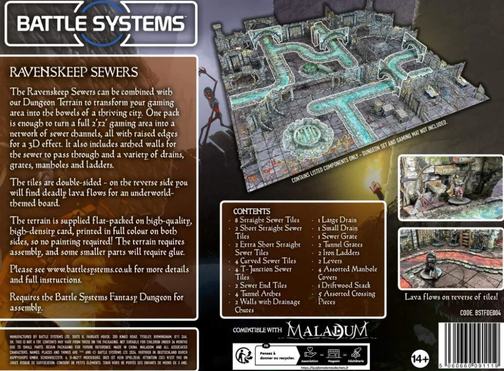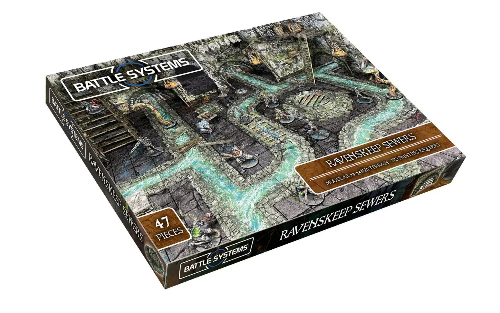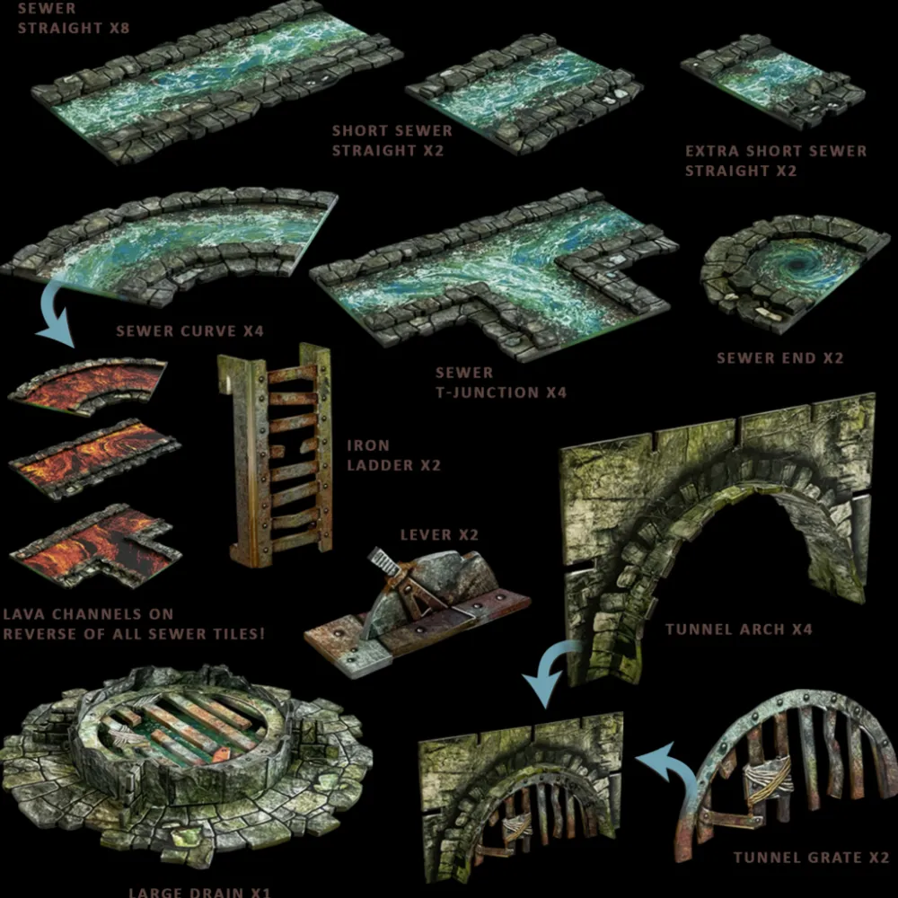 The Ravenskeep Sewers can be combined with our Dungeon Terrain to transform your gaming area into the bowels of a thriving city. One pack is enough to turn a full 2’x2′ gaming area into a network of sewer channels, all with raised edges for a 3D effect. It also includes arched walls for the sewer to pass through and a variety of drains, grates, manholes and ladders.