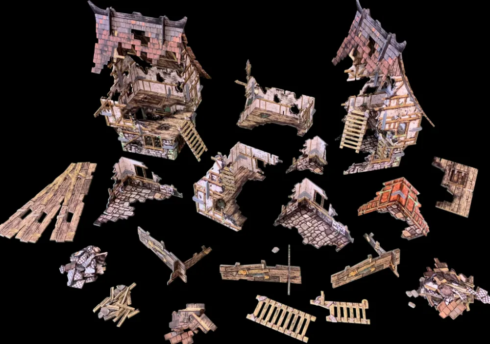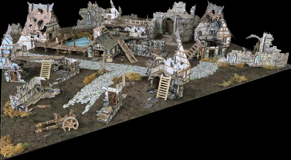 This box contains everything you need to turn your gaming table into a devastated town, suitable for many 28-35mm fantasy and historical games. The set can be used on its own to create a heavily ruined settlement, or the modular pieces can be combined with the other Fantasy Village buildings to partially ruin a whole town! The set includes walkways, ladders and other scatter terrain to accessorise your table.