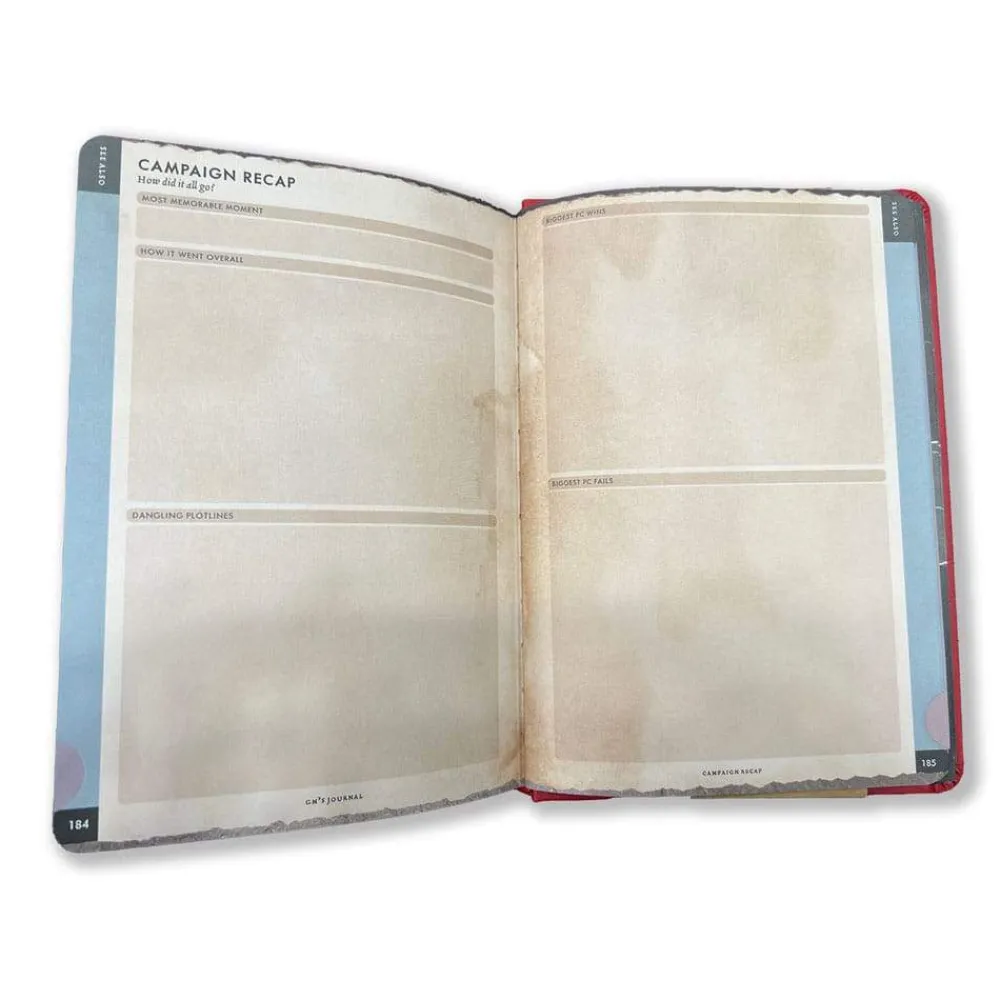 This A5-sized (5.8″ x 8.3″) journal is almost 200 pages for you to keep your plans, record your notes, and manage your adventure. There are sections for tracking magic items, roleplaying bonuses, great moments, embarrassing defeats, and even who still owes you for pizza.