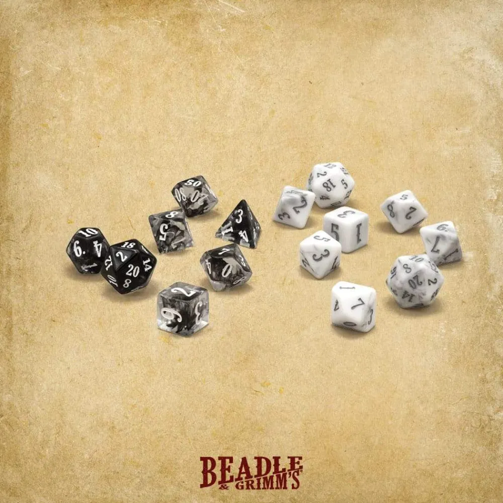 Realize your full potential as a Game Master or Hero with these leveled-up dice sets from Beadle & Grimm’s. Each set contains beautiful resin dice specific to your role, and those dice will roll beautifully in the large, EVA-lined tins that double as rolling trays! Open this tin and unleash 15 dice in two distinct styles, with extra d8s and d10s for battle superiority and two extra d20s to attack at advantage!