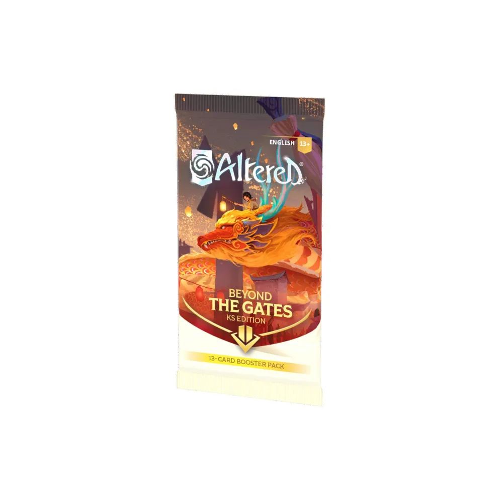 The Beyond the Gates KS Edition contains all the unlocked stretch goals from the Kickstarter campaign. Start your Altered journey with a boost and enjoy better booster packs with drop rates for Uniques and Rares, alternate art cards, foil heroes in every booster packs, an exclusive set logo on every card, and more!