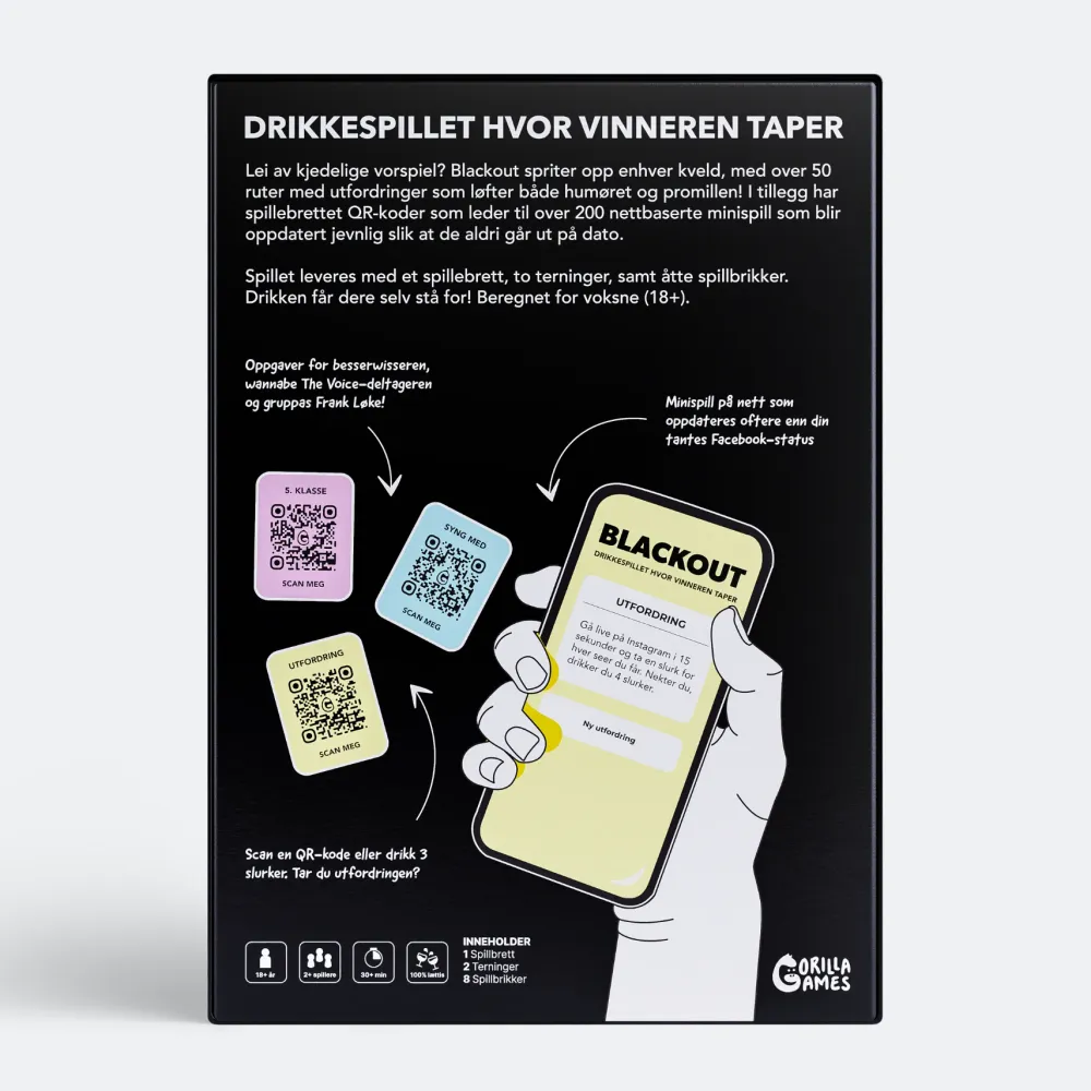 Lei av kjedelige vorspiel? Blackout spriter opp enhver kveld, med over 50 ruter med utfordringer som løfter både humøret og promillen! I tillegg har spillebrettet QR-koder som leder til over 200 nettbaserte minispill som blir oppdatert jevnlig slik at de aldri går ut på dato