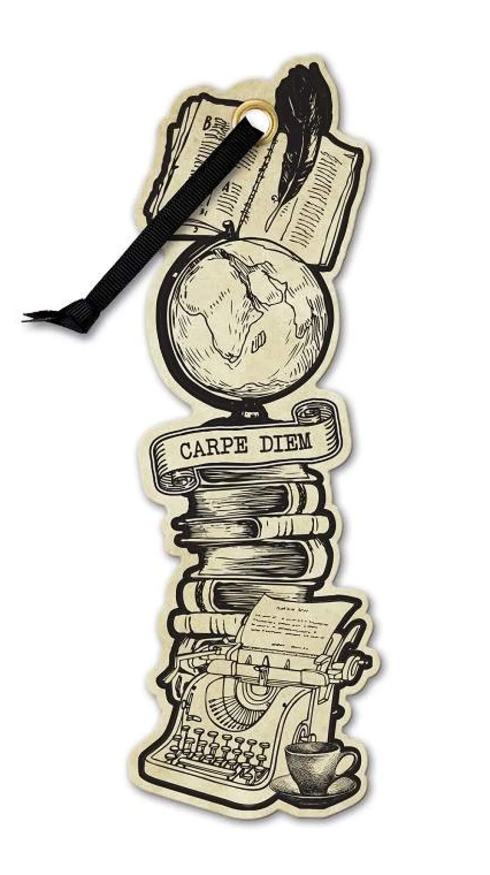 Bokmerke «Carpe Diem» i Academia Collection i kraftig kvalitetskartong med tekstilbånd. Bokmerket er trykket på FSC MIX Paper C134008.