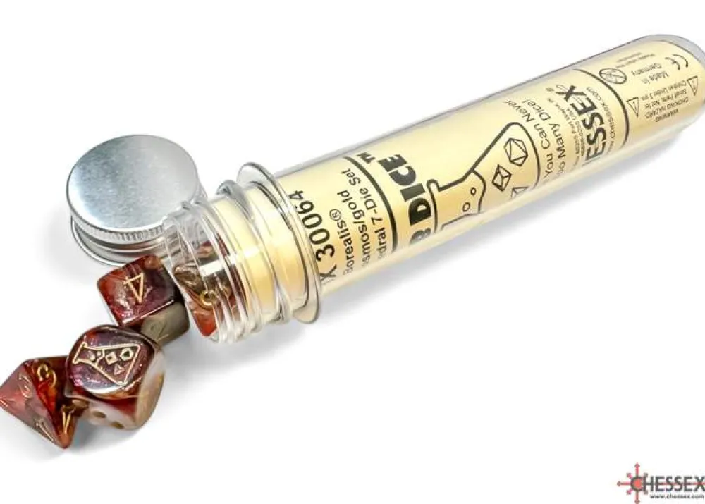 This set contains 8 Borealis® Cosmos™ dice with gold numbers with the following shapes: