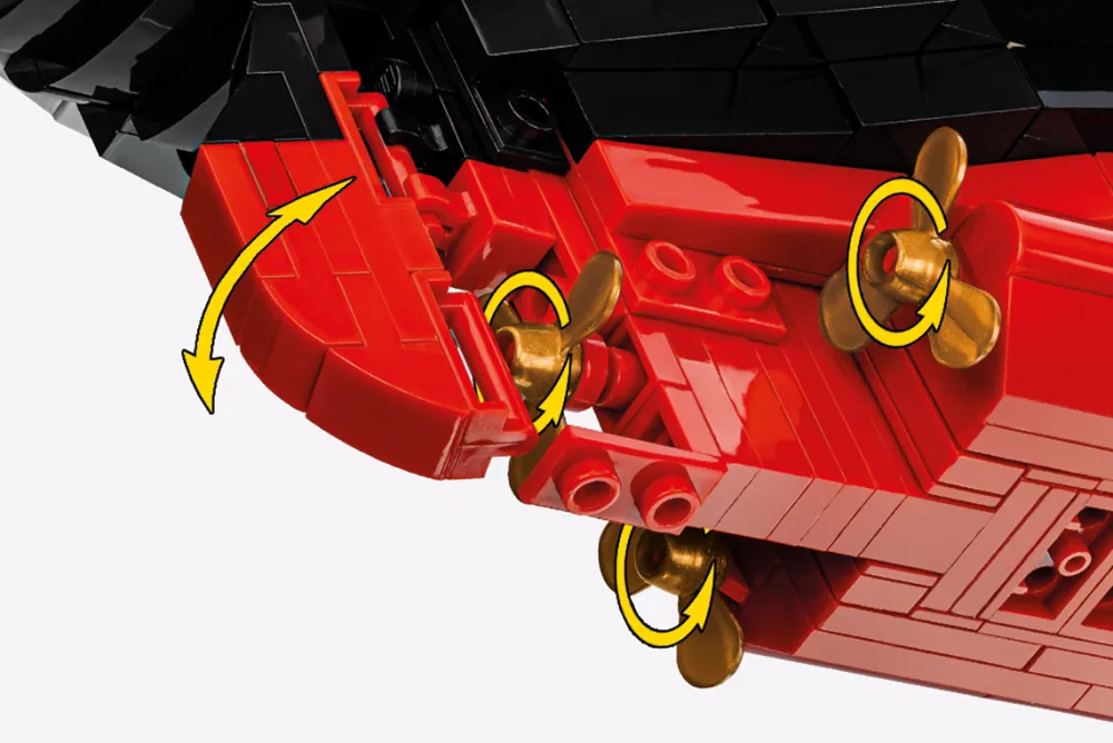 Bevegelige elementer – Modellen har en rekke bevegelige elementer som gir autentisitet og muliggjør enda større interaksjon. Disse inkluderer propeller og skipskraner.