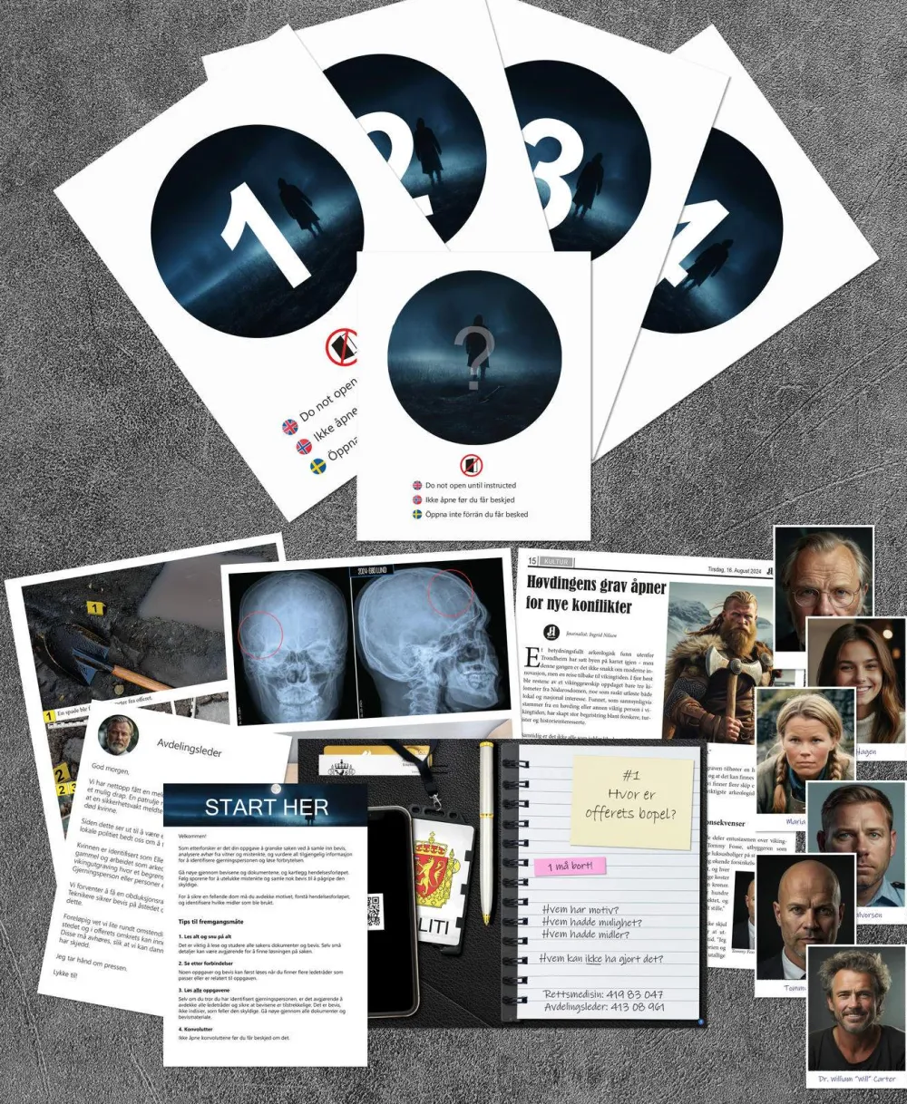 Bli med og løs en av Norges kriminalsaker. Dere mottar saksmappen med alle dokumentene og ledetrådene dere trenger for å løse saken. Sammen skal dere følge sporene, analysere bevisene og samarbeide for å pusle sammen bitene – og til slutt forhåpentligvis avsløre den skyldige.