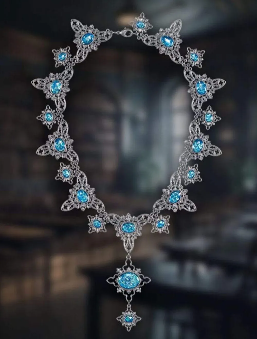 Complete with 20 iridescent blue stones and intricate aged silver metal embellishments, keep it safe or show it off with its 33 cm tall leatherette collector’s display box, featuring metal swing clasps and lined with plush black velour fabric. The necklace is approximately 16 by 30cm with an adjustable clasp.