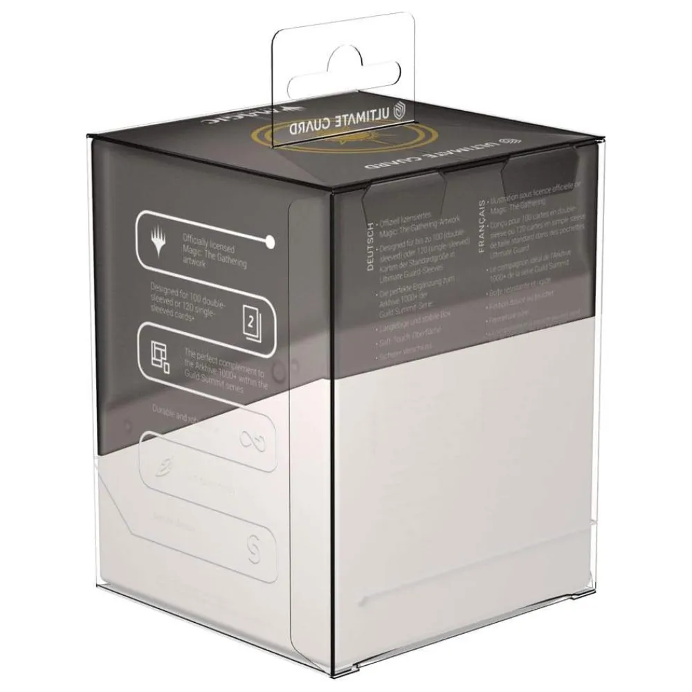 Ultimate Guard celebrates one of the most iconic and popular planes in Magic: The Gathering’s history with the «Guild Summit» series: Ten elegant Boulder 100+ featuring the golden crest of each guild on the semi-transparent deck boxes, all with a silky soft-touch finish. The Boulder 100+ holds up to 100 double-sleeved cards, making it the perfect home for your two-color Commander deck! Don’t miss out on the stunning Arkhive 1000+ Xenoskin from the «Guild Summit» series either, which is the perfect storage place for up to ten Boulder 100+.