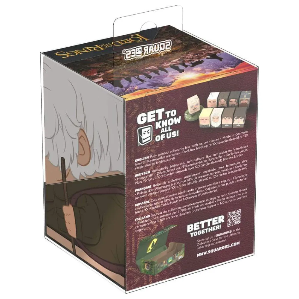 Collectible box for storing TCG decks, tabletop gaming accessories, and/or collectibles. The Bilbo Squaroe from the The Lord of the Rings edition holds up to 100 cards in double protective sleeves if used as a deck box. Squaroes are made from 78% renewable resources and fit perfectly into the separately available Collectors Case.
