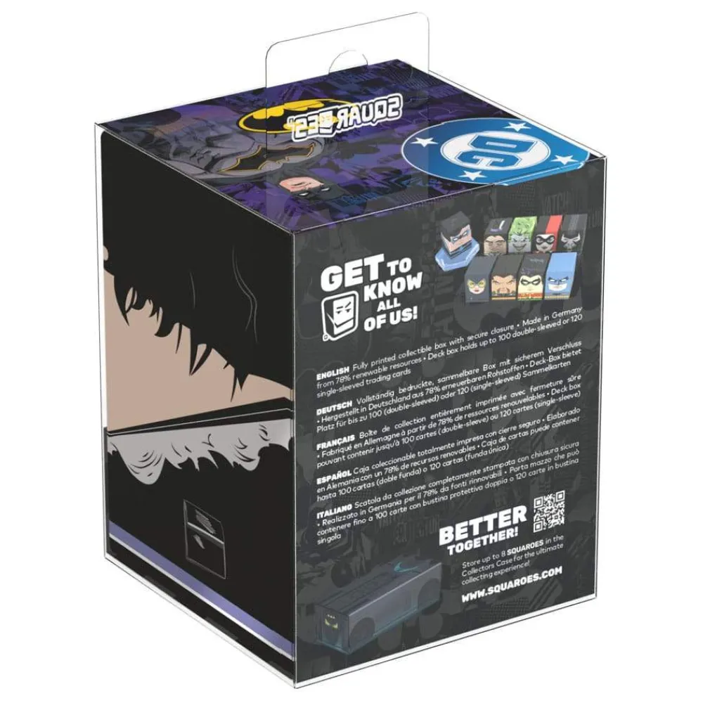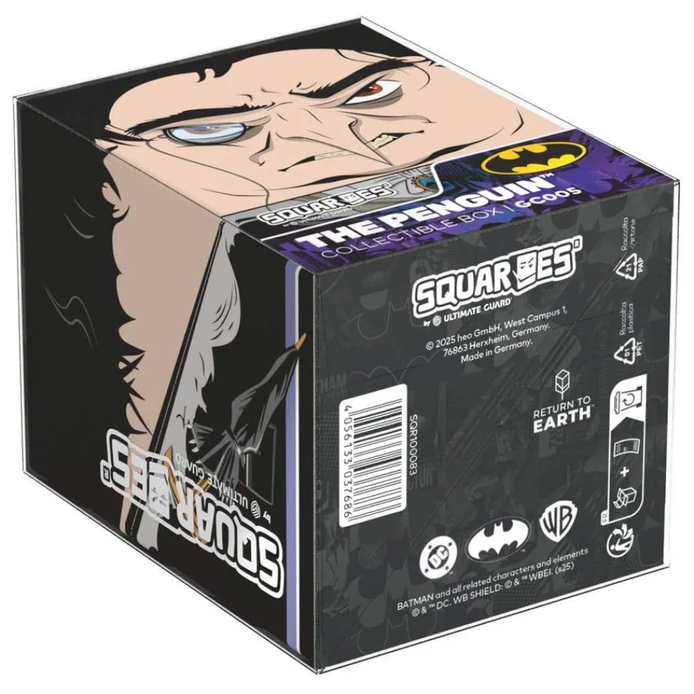 Collectible box for storing TCG decks, tabletop gaming accessories, and/or collectibles. The Penguin Squaroe from the Batman: Gotham City edition holds up to 100 cards in double protective sleeves if used as a deck box. Squaroes are made from 78% renewable resources and fit perfectly into the separately available Collectors Case.