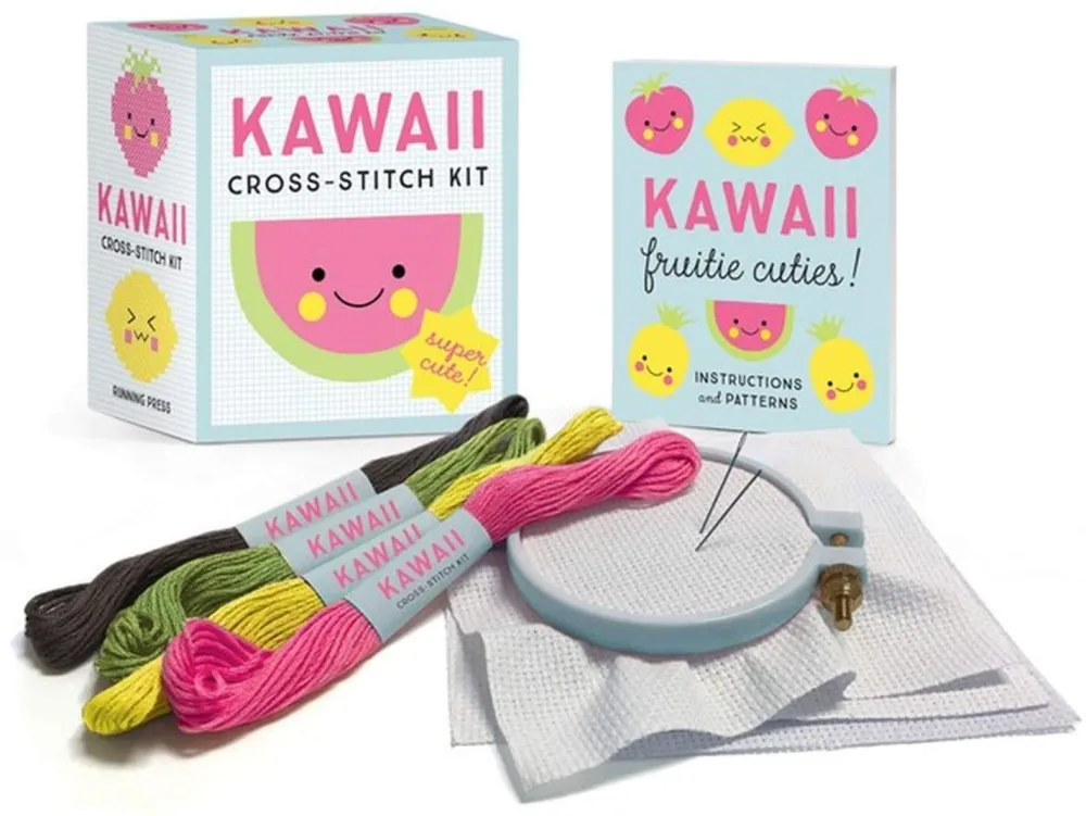 4 kawaii-style cross-stitch patterns (fruitie cuties: mellow watermelon, blushing berry, pretty pineapple, sour lemon) 3 pieces of 4″ x 4″ cotton Aida cloth 3-inch embroidery hoop 2 tapestry needles 4 skeins of embroidery thread