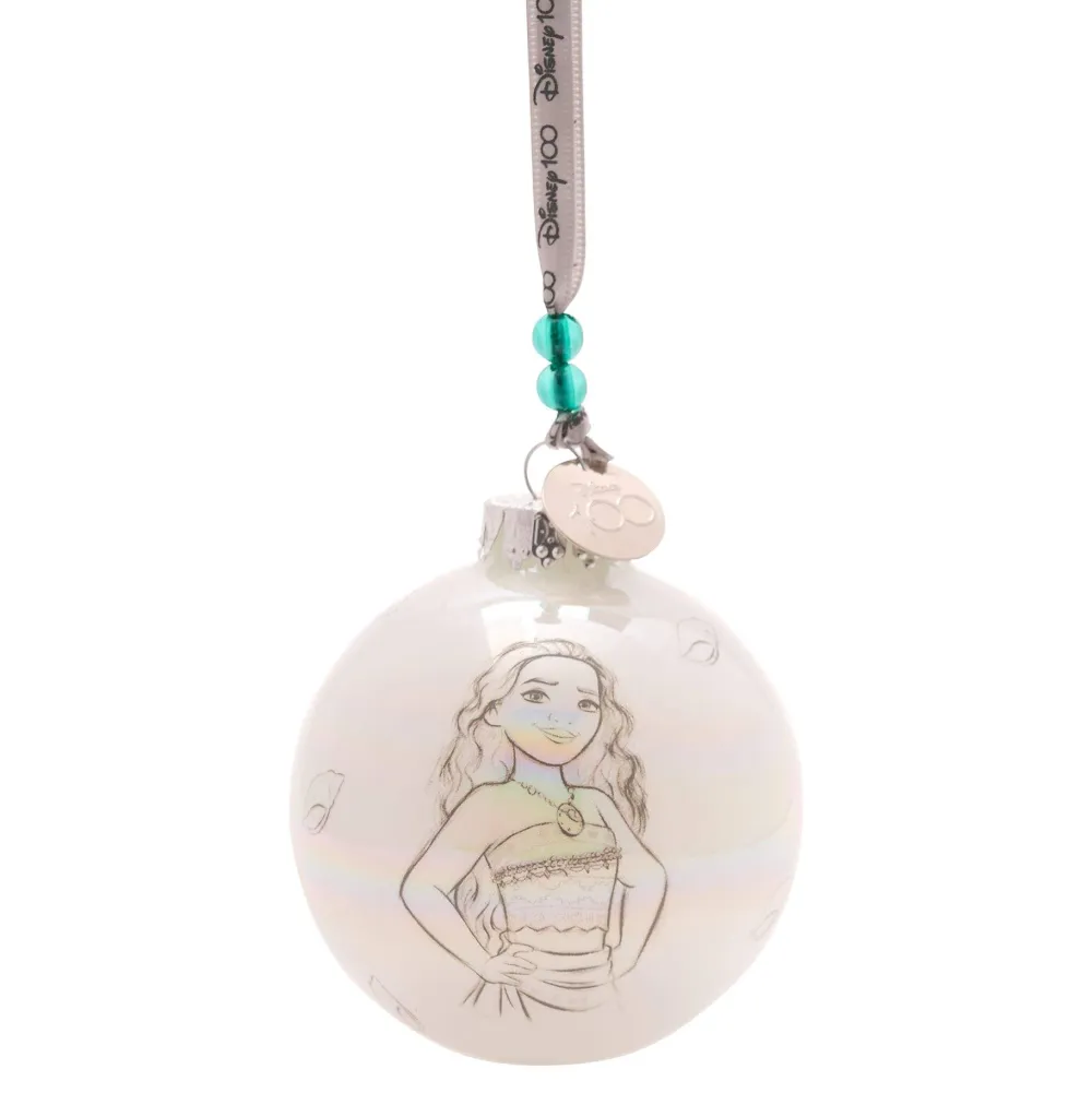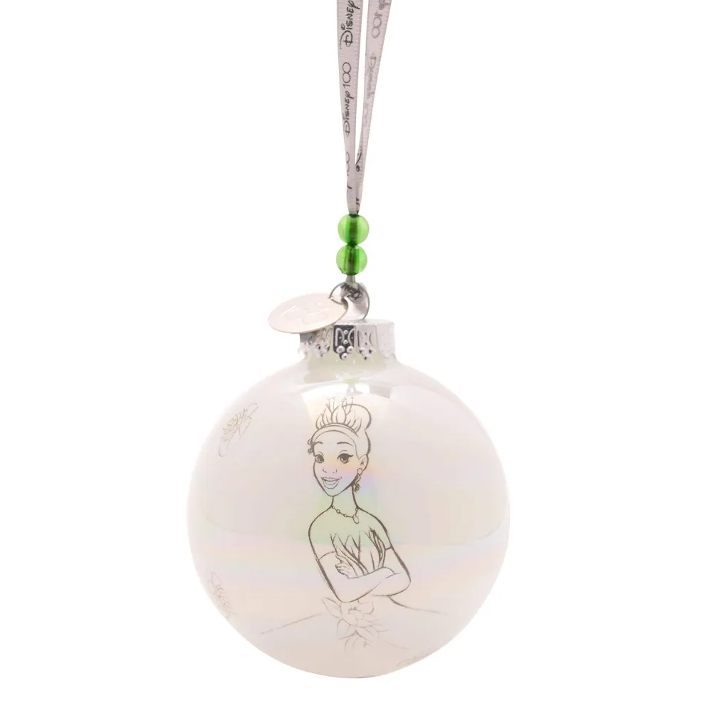 The white ceramic baubles showcase individual printed pencil sketch illustrations of Disney princesses, complete with a shiny finish. They are finished by a silver topper, upon which the silver ‘Disney 100’ ribbon hanger is attached, alongside a matching silver metal charm and colourful glass beads.