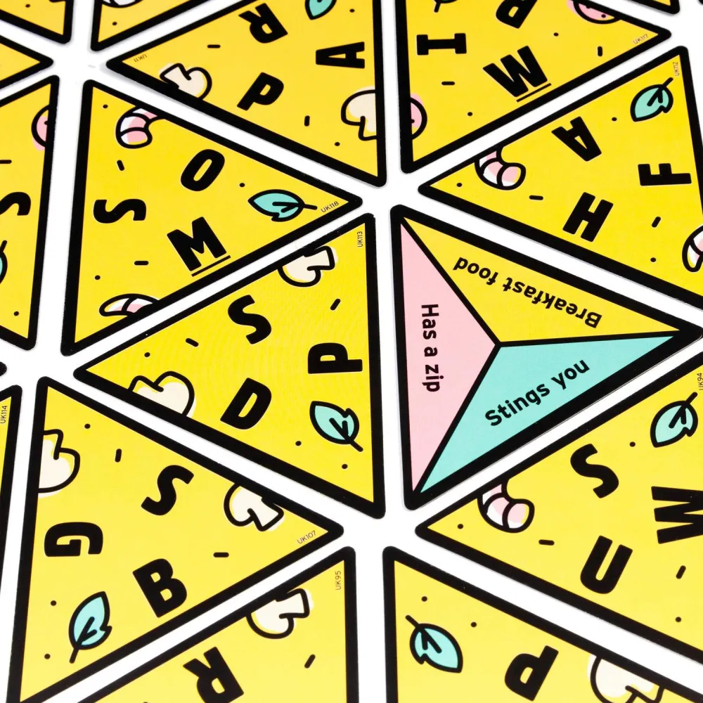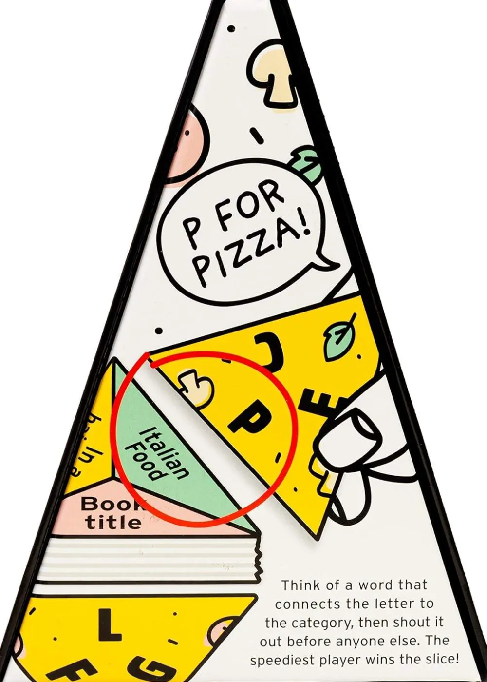 The aim of the game is to build your giant slice of pizza by winning small triangles of pizza. To win a triangle you must be the first player to shout out a word that links the category and the letter on the cards. So if the letter is B and the category is TV Shows, you could shout «Baywatch!». If you’re first to shout a correct answer, you win the card. Now flip a new card and go again.
