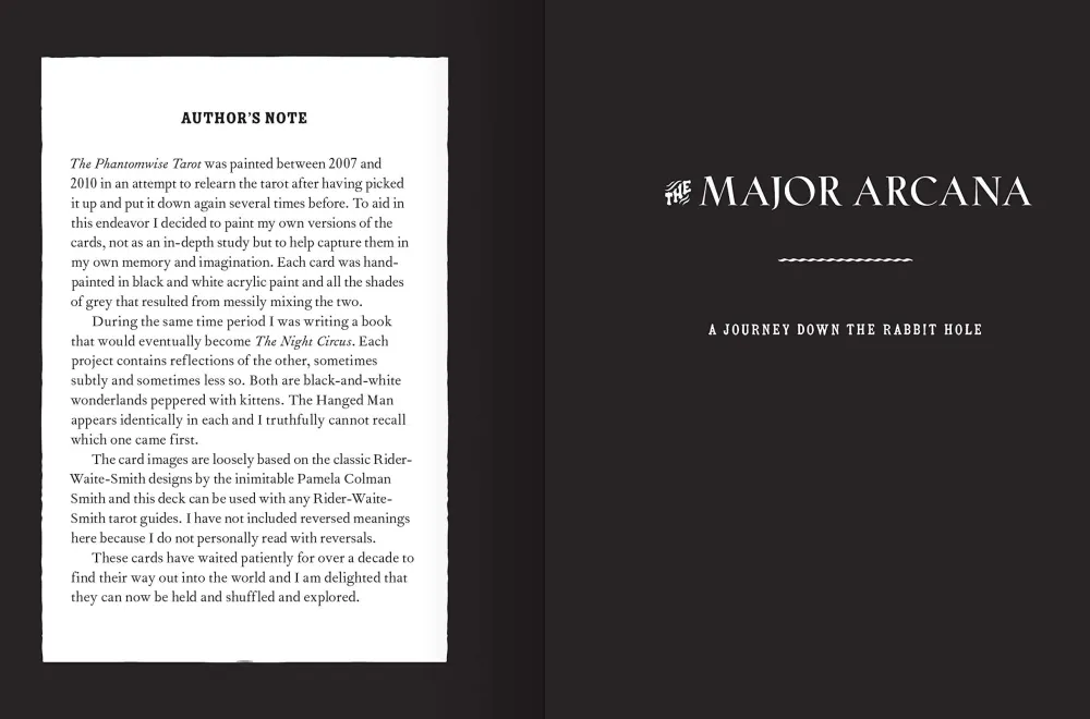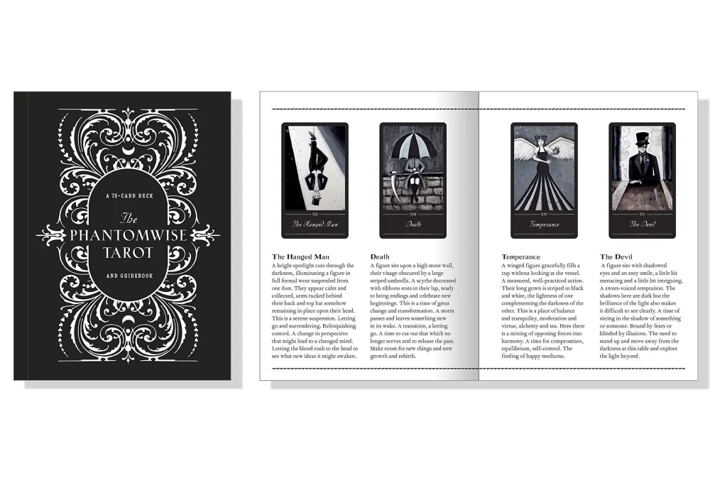 Welcome to The Phantomwise Tarot. This black-and-white world is a little bit circusy, a little bit Wonderland, and a little bit nocturnal phantasia of its own invention. It is a mix of myth and fairy tale, where each individual you meet may be an illusion, reflection, or distortion.