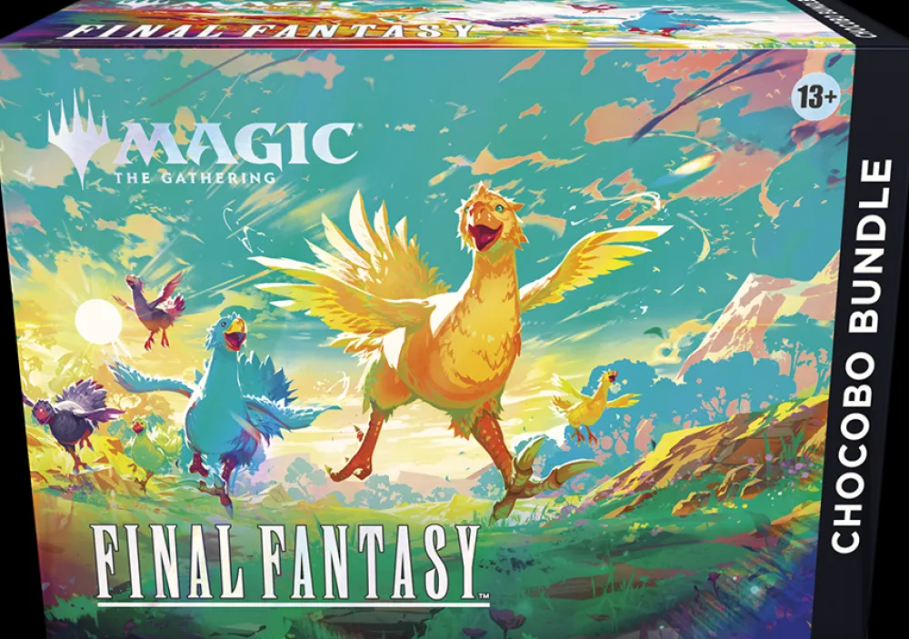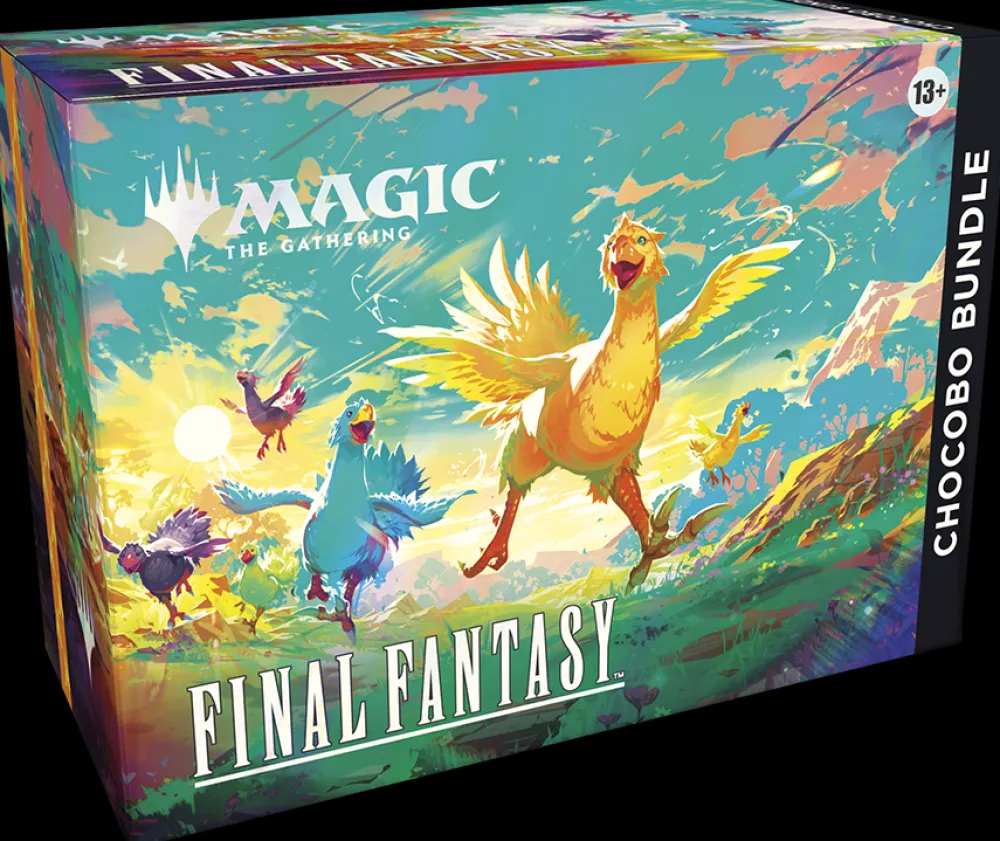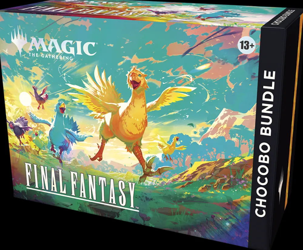 Calling all chocobo fans! Celebrate your fleet-footed, feathered friends with this charming bundle, featuring Full-Art Chocobo Basics, an exclusive promo card, a chocobo-themed Click Wheel life counter, plus a whole nest of Magic: The Gathering—FINAL FANTASY Play Boosters and other goodies. Whether you’re a fan yourself or have one in your life, this gift-ready box is the next-best thing to a real chocobo! This Chocobo Bundle contains 10 Magic: The Gathering—FINAL FANTASY Play Boosters, a 12-card Chocobo Booster, 1 Traditional Foil alt-art promo card, 1 of 24 Borderless Magic: The Gathering®—FINAL FANTASY Scene Cards, 32 FINAL FANTASY Landmark Full-Art Basic Lands (16 Traditional Foil, 16 regular), a special Click Wheel life counter, and a Chocobo Edition card box. The Chocobo Booster contains 10 Full-Art Chocobo Basic Land cards and 2 Borderless Chocobo Bundle cards of rarity Rare or higher. This product does not contain a Golden Chocobo card (available in English-language Collector Boosters only).