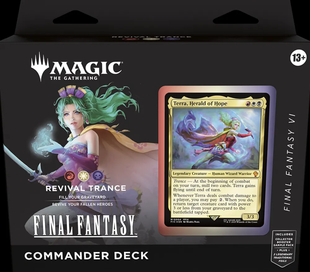 In Commander, four players come together to show their strength and strategy, with one player coming out on top. Each 100-card ready-to-play Magic: The Gathering®—FINAL FANTASY Commander Deck makes it easy for Commander fans in your store to grab a deck and play right away.