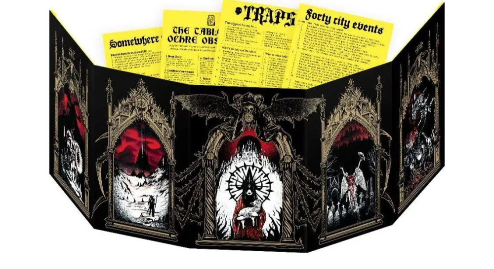 MÖRK BORG GM Screen: A five-paneled portrait wall of death. Printed with gold metallic ink on one side and vivid neon yellow on the other. The front is all art, five scenes of various locales and important characters in the Dying world. The GM-facing side sports a wide array of tables and rules summaries that might come in handy during play.
