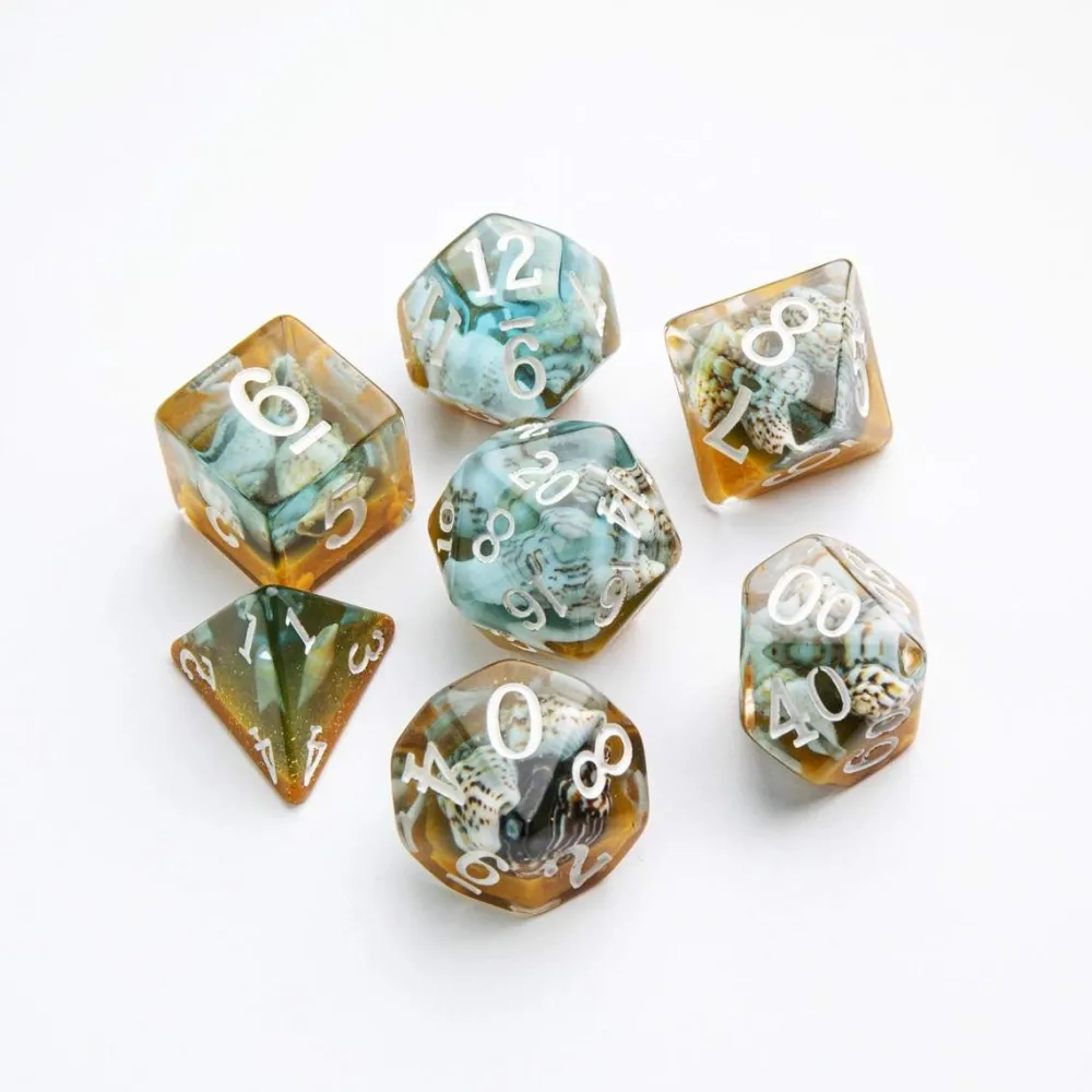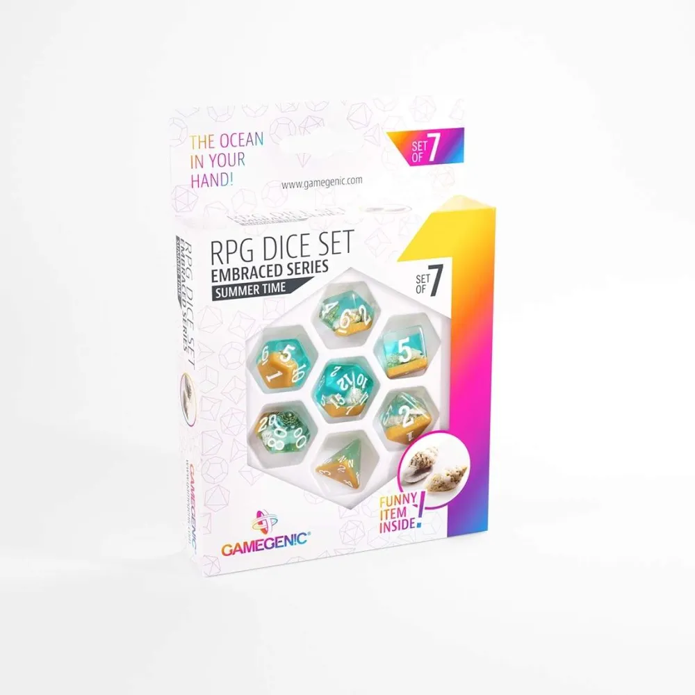 Choose your weapon! This dice set contains a D4, a D6, a D8, two D10 (10 and 00), a D12 and a D20. All dice are round-cornered and manufactured at a premium level. The Embraced Dice have an interesting item inside the cube and will make your game night a critical hit. They are packed in a window cardboard box that displays all dice at the front.