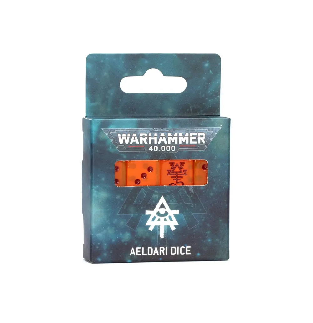 This is a set of 16 square-cornered six-sided dice for games of Warhammer 40,000, themed around the Aeldari. These dice are cast in orange plastic with dark red markings. The 1-5 facings are traditionally pipped, but each ‘6’ face is instead decorated with an icon of the Aeldari.