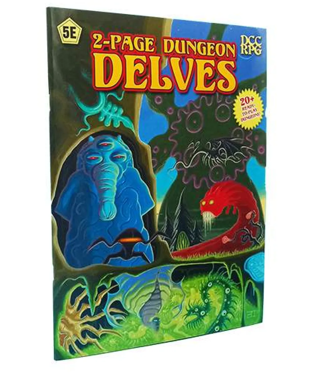 This companion piece is a compilation of over 20 two-page adventures set in a wide variety of environments for variable character levels. Each Delve is exactly two pages long and features one or more monsters from Dungeon Denizens, a map, an illustration, and 3 to 5 encounter areas. These dungeons are perfect for one session of play. This book is system neutral and can be used for your 5E or DCCRPG game, along with a copy of Dungeon Denizens.