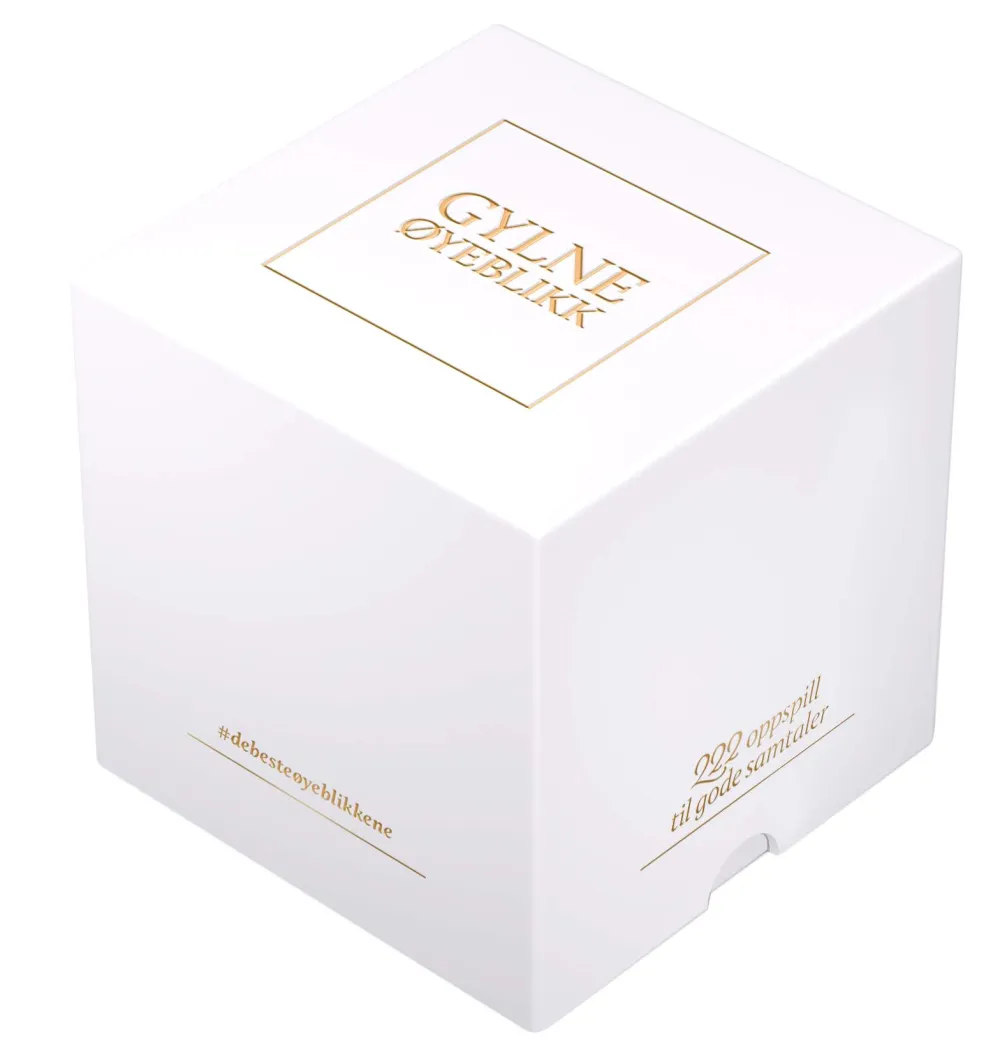 I Gylne øyeblikk snakker deltakerne om de gode tingene i livet. Hva betyr noe for deg, hva er en god opplevelse, hvilke ingredienser må med for at man skal skape gode minner? Dette er spillet både for den som vil mimre med sine beste venner og for den som vil snakke om de viktige tingene med folk man vil bli bedre kjent med. Med Gylne øyeblikk samler du venneflokken, familien, kjæresten/ektefellen, eller – uha – kanskje kolleger?