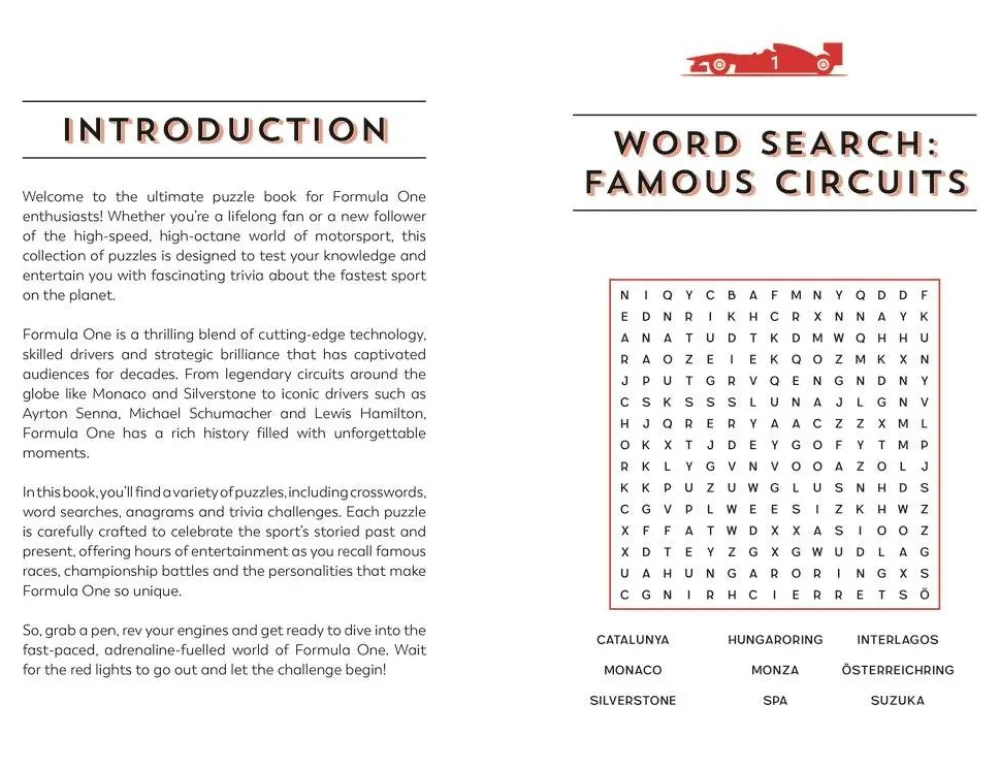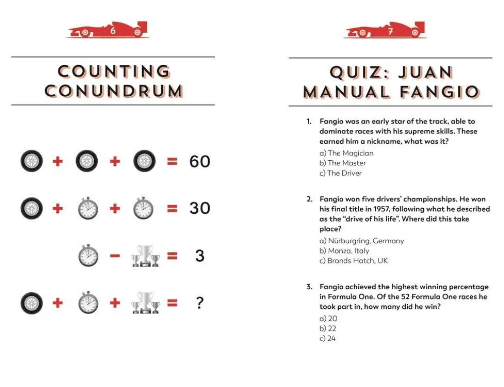 Whether you choose to cruise through the championship, or just have time for a pit stop, there is plenty within these pages to jump-start your need to win. Speed through classic conundrums and light-hearted games to take pole position as you prove your knowledge of the cars, the stars and the races.