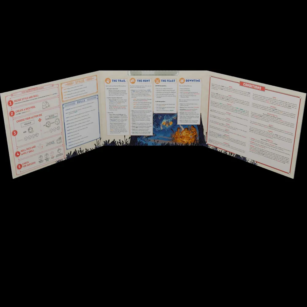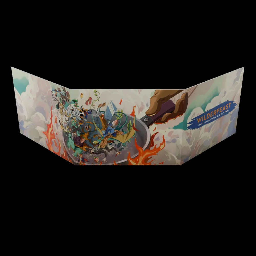 A premium game master screen for the Wilderfeast roleplaying game, with useful information on key gameplay elements printed on the inner side, to help the Guide while running games.