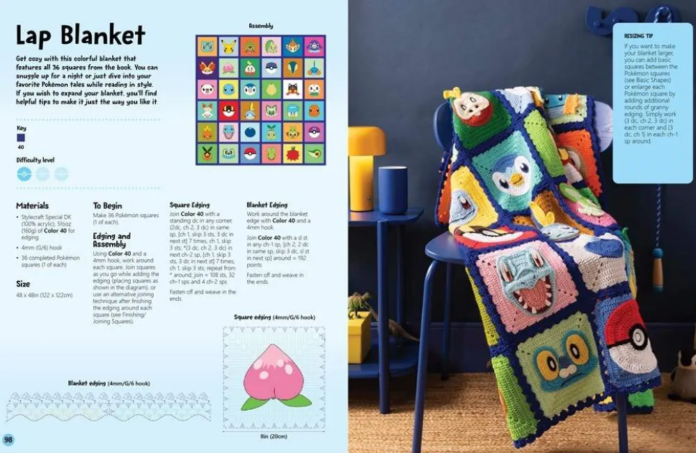 Crochet Pikachu, Bulbasaur, Charmander, Squirtle and more, plus Poké Balls and berries, with 36 different squares to choose from. In addition to the adorable Pokémon patterns, this book is packed with creative ideas for using your completed squares. Turn them into charming pillows, cozy blankets, and so much more.