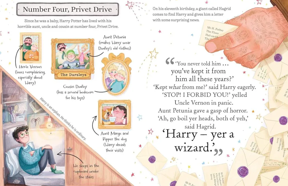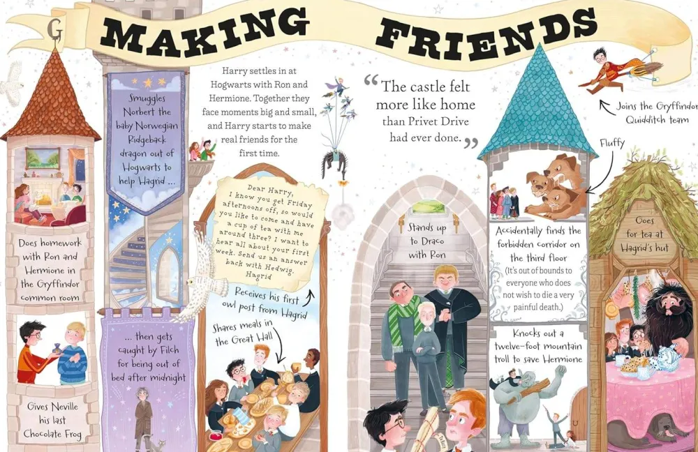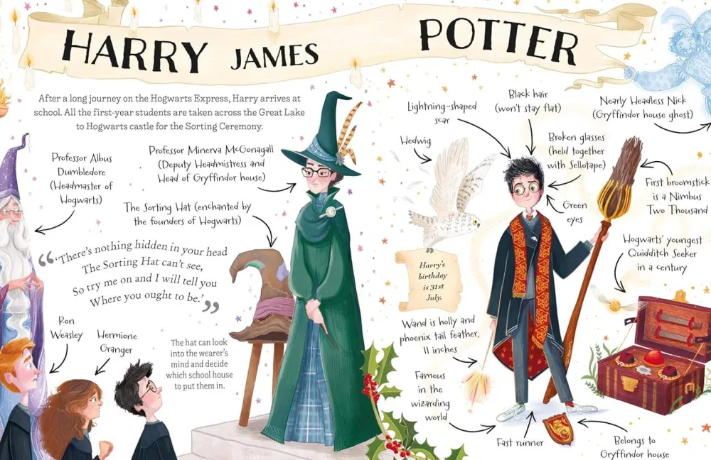 Find out all this and much more about Harry Potter! Peek at Harry in his spidery cupboard under the stairs, find out what he buys in Diagon Alley and explore the Gryffindor dormitory. Get set for dragon encounters, Quidditch thrills, secret passwords and a wand from Ollivanders …