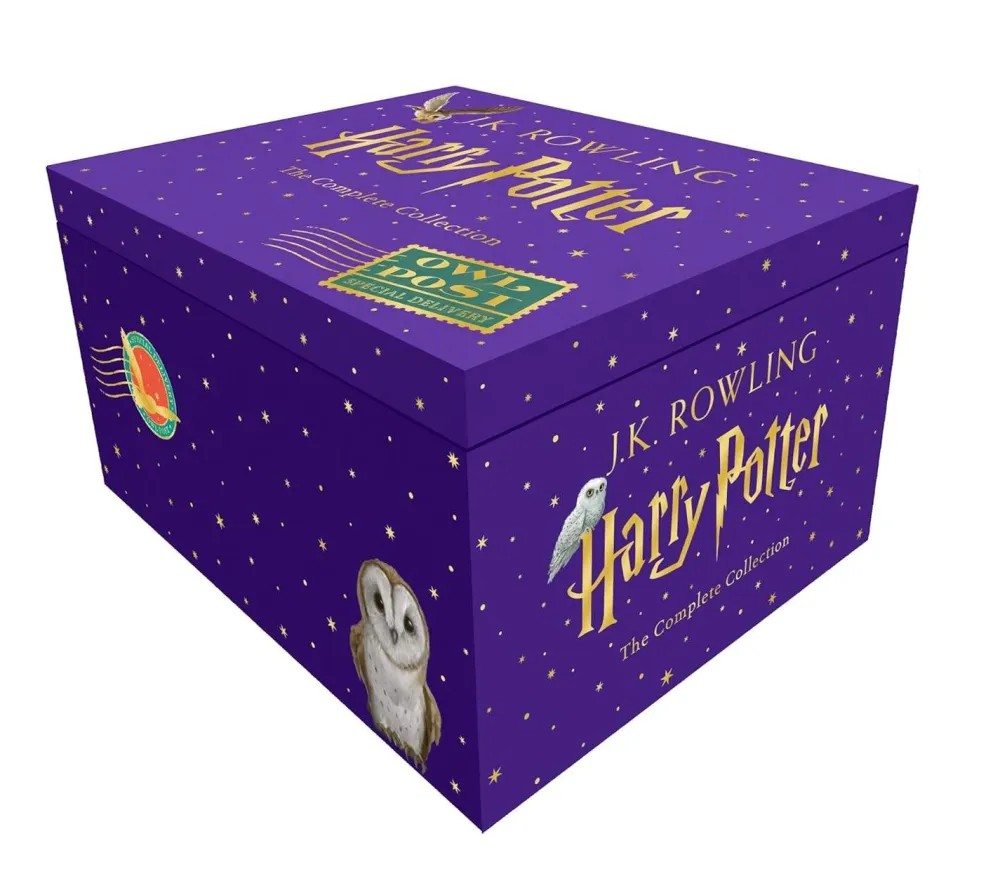This starry book trunk, decorated with magical owls and postmarks, is the ultimate way to escape to Hogwarts! Seven beautiful hardbacks are collected inside, featuring spectacular cover illustrations by Jonny Duddle, as well as quizzes, listicles and fun facts at the back of each story. This special delivery arrives in a protective cardboard sleeve and also includes a sheet of colourful stickers. There’s even a special name label for readers to personalise their own Harry Potter set.