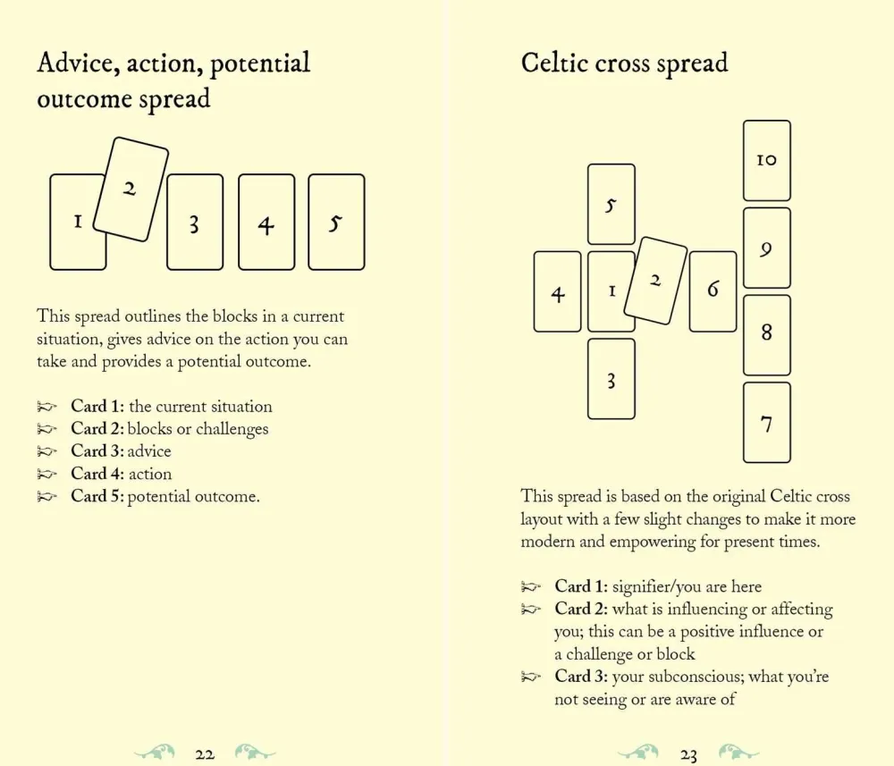 Unlike standard tarot decks, this one includes the meanings on the cards, creating an easy-to-use introduction to tarot reading — no booklet needed to start with, but one is included to develop your practice.