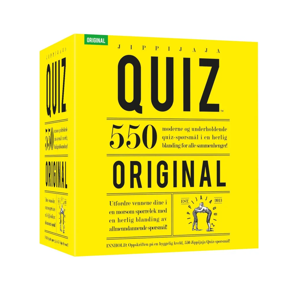 Jippijaja Quiz Original er et medrivendespørre-spill med en spennende blanding av sport, mote, musikk, historie, filmog mye annet. Et fantastisk underholdende spørrespill med moderne, morsomme ogpasse vanskelige spørsmål!