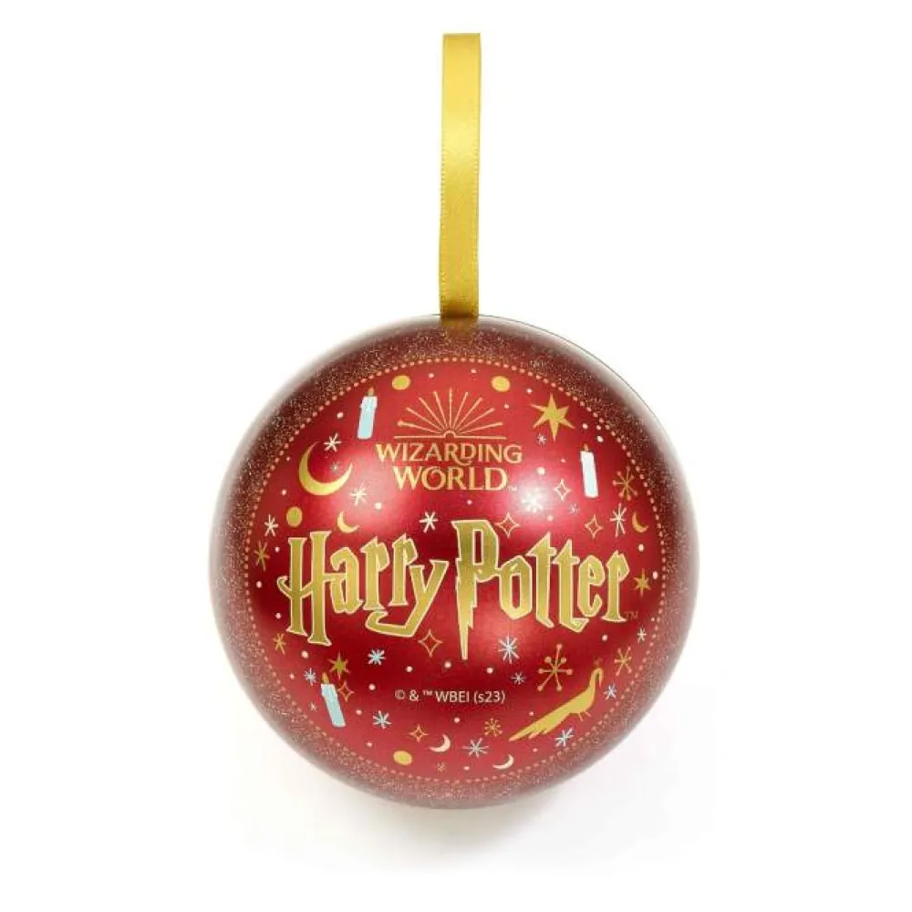 A red metallic tin bauble with a Deck the Hall and house shields design, opens to reveal a gold-plated Sorting hat Keyring.