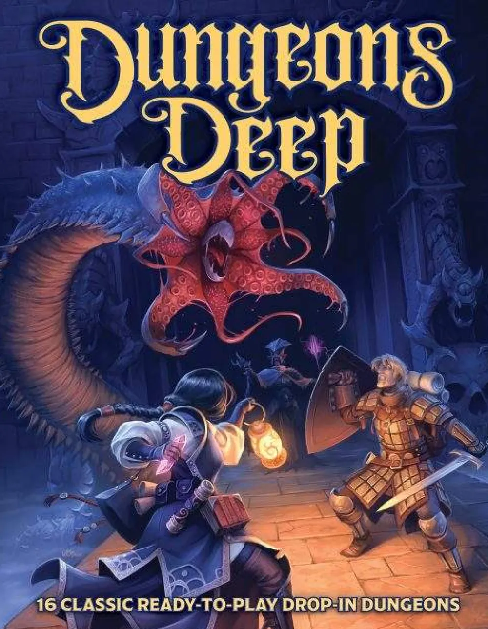 In a world of high fantasy adventure, every crumbling ziggurat, abandoned mine, or unassuming hole in the ground is a potential dungeon. Dungeons Deep delivers 16 drop-in dungeons designed to fit neatly into your D&D campaign—or to quickly expand an existing dungeon of your own design. Unleash your crack team of dungeoneers and enjoy the story!