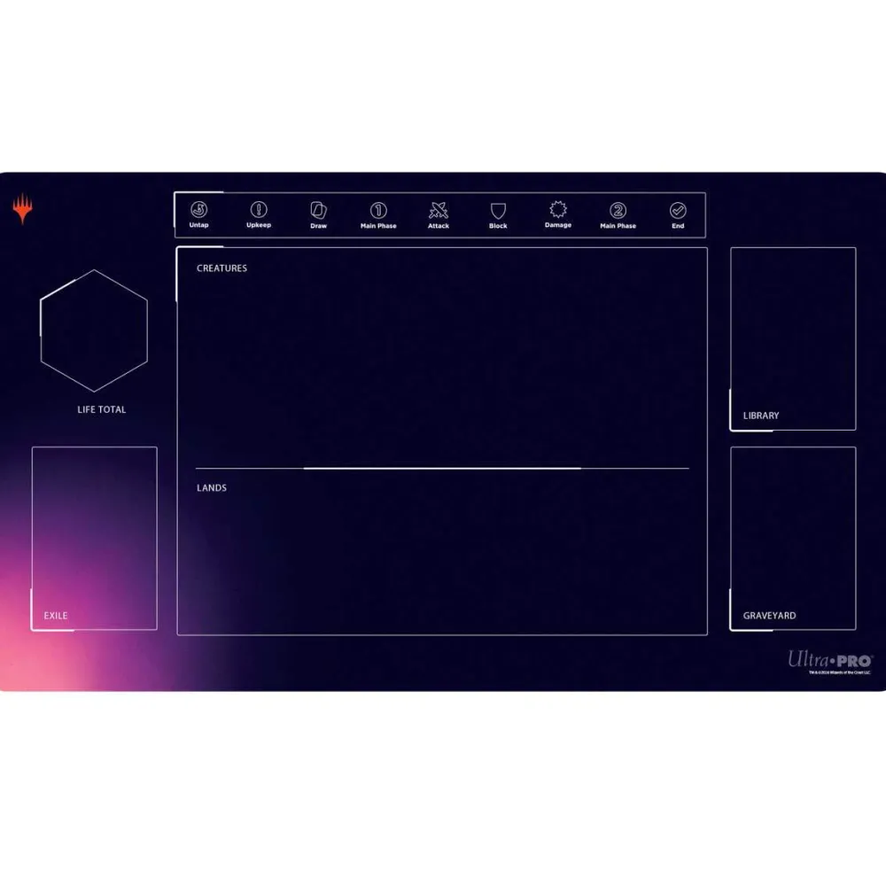Start your Magic: The Gathering journey on solid foundations with Learn To Play playmats, designed to introduce beginners to the basics of gameplay! This standard size 1-Player playmat features guides for card placement, gameplay steps, and turn phases to assist new players during gameplay. Each playmat is made with a soft fabric top to reduce damage to cards, and the non-slip rubber backing keeps the playmat from shifting during use. Dimensions measure approximately 24 in. x 13.5 in.