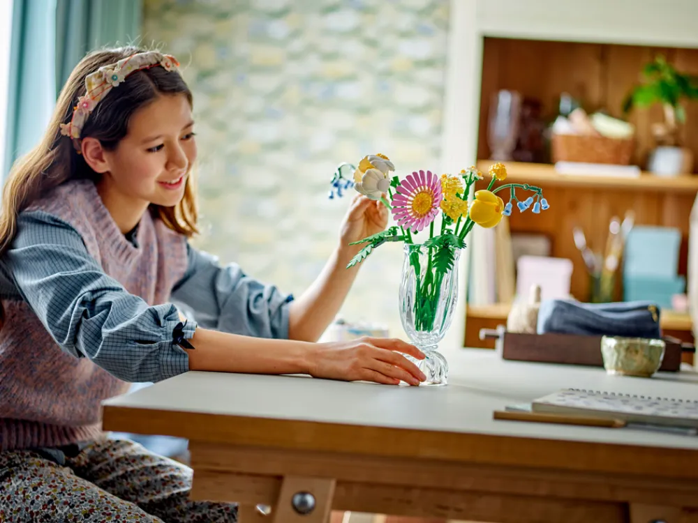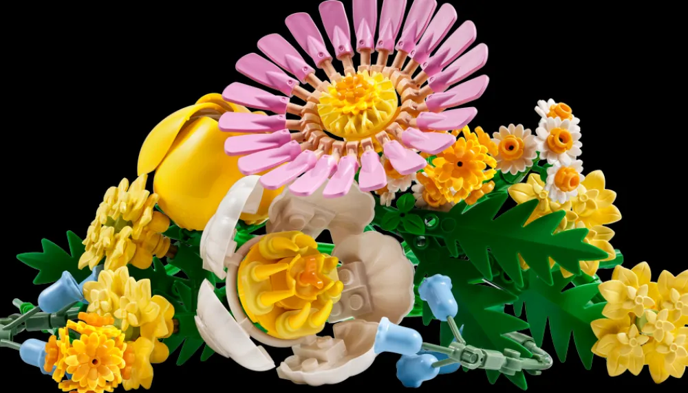 Spirende blomsterdekoratører i alle aldre kan glede seg til masse byggemoro med denne buketten som består av forskjellige LEGO blomster, inkludert gullball, blåklokke, bregne, gul ryllik, rosa gerbera, peon og tulipan, og etterpå kan de justere blomsterstilkene for å skape en unik bukett. Etter å ha bygget og tilpasset buketten, kan barn og voksne stille den ut på soverommet eller bruke den som pynt på et bord.